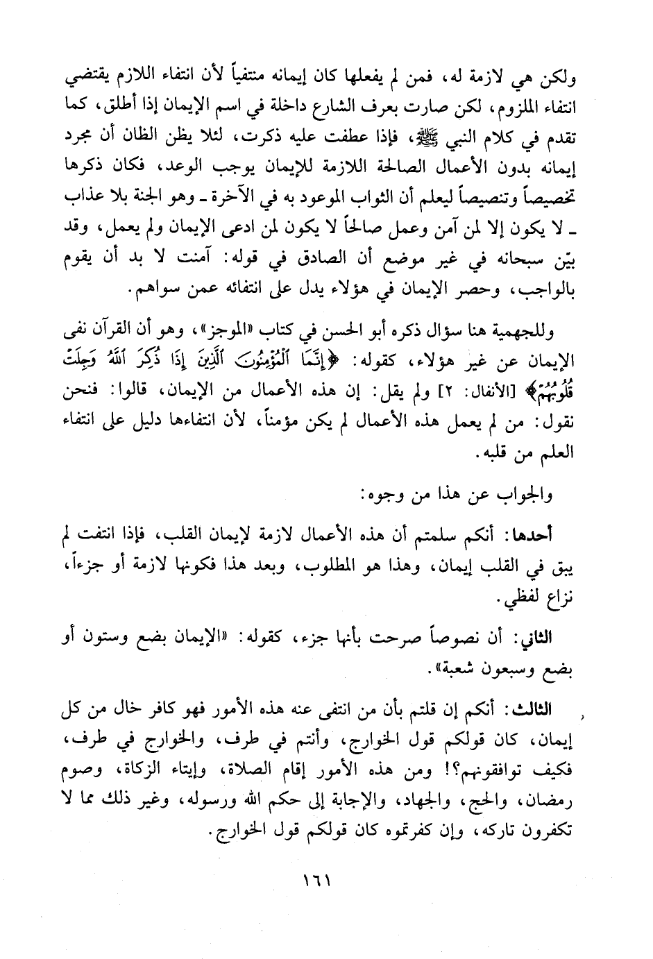 وللجهمية هنا سؤال ذكره أبو الحسن في كتاب [الموجز] وهو أن القرآن نفي الإيمان عن غير هؤلاء، كقوله: {إِنَّمَا الْمُؤْمِنُونَ الَّذِينَ إِذَا ذُكِرَ اللهُ وَجِلَتْ قُلُوبُهُمْ} [الأنفال: 2] ، ولم يقل: إن هذه الأعمال من الإيمان، قالوا: فنحن نقول: من لم يعمل هذه الأعمال لم يكن مؤمناً، لأن انتفاءها دليل على انتفاء العلم من قلبه.