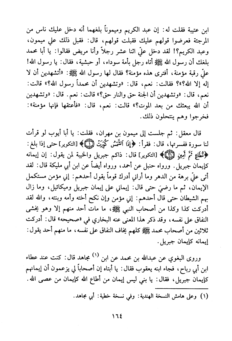 ابن عتبة فقلت له: إن عبد الكريم وميموناً بلغهما أنه دخل عليك ناس من المرجئة، فعرضوا بقولهم عليك فقبلت قولهم، قال: فقبل ذلك على ميمون، وعبد الكريم؟ ! لقد دخل علي اثنا عشر رجلاً وأنا مريض، فقالوا: يا أبا محمد، بلغك أن رسول الله صلى الله عليه وسلم أتاه رجل بأمة سوداء، أو حبشية، فقال: يا رسول الله، على رقبة مؤمنة، أفترى هذه مؤمنة؟ فقال لها رسول الله صلى الله عليه وسلم: " أتشهدين أن لا إله إلا الله؟ ". فقالت: نعم. قال: " وتشهدين أن محمداً رسول الله؟ ". قالت: نعم، قال: " وتشهدين أن الجنة حق والنار حق ". قالت: نعم، قال: " وتشهدين أن الله يبعثك من بعد الموت؟ ". قالت: نعم، قال: " فأعتقها فإنها مؤمنة "، فخرجوا وهم ينتحلون ذلك. قال معقل: ثم جلست إلى ميمون بن مِهْران، فقلت: يا أبا أيوب، لو قرأت لنا سورة ففسرتها، قال: فقرأ {إِذَا الشَّمْسُ كُوِّرَتْ} حتى إذا بلغ: {مُطَاعٍ ثَمَّ أَمِينٍ} [التكوير: 1: 21] قال: ذاكم جبريل، والخيبة لمن يقول: إن إيمانه كإيمان جبريل، ورواه حنبل عن أحمد، ورواه أيضاً عن ابن أبي مُلَيْكَة قال: لقد أتى علي بُرْهَة من الدهر وما أراني أدرك قومًا يقول أحدهم: إني مؤمن مستكمل الإيمان، ثم ما رضي حتى قال: إيماني على إيمان جبريل وميكائيل، وما زال بهم الشيطان حتى قال أحدهم: إني مؤمن وإن نكح أخته وأمه وبنته، والله لقد أدركت كذا وكذا من أصحاب النبي صلى الله عليه وسلم، ما مات أحد منهم إلا وهو يخشى النفاق على نفسه، وقد ذكر هذا المعنى عنه البخاري في صحيحه، قال: أدركت ثلاثين من أصحاب محمد صلى الله عليه وسلم كلهم يخاف النفاق على نفسه، ما منهم أحد يقول: إيمانه كإيمان جبريل.