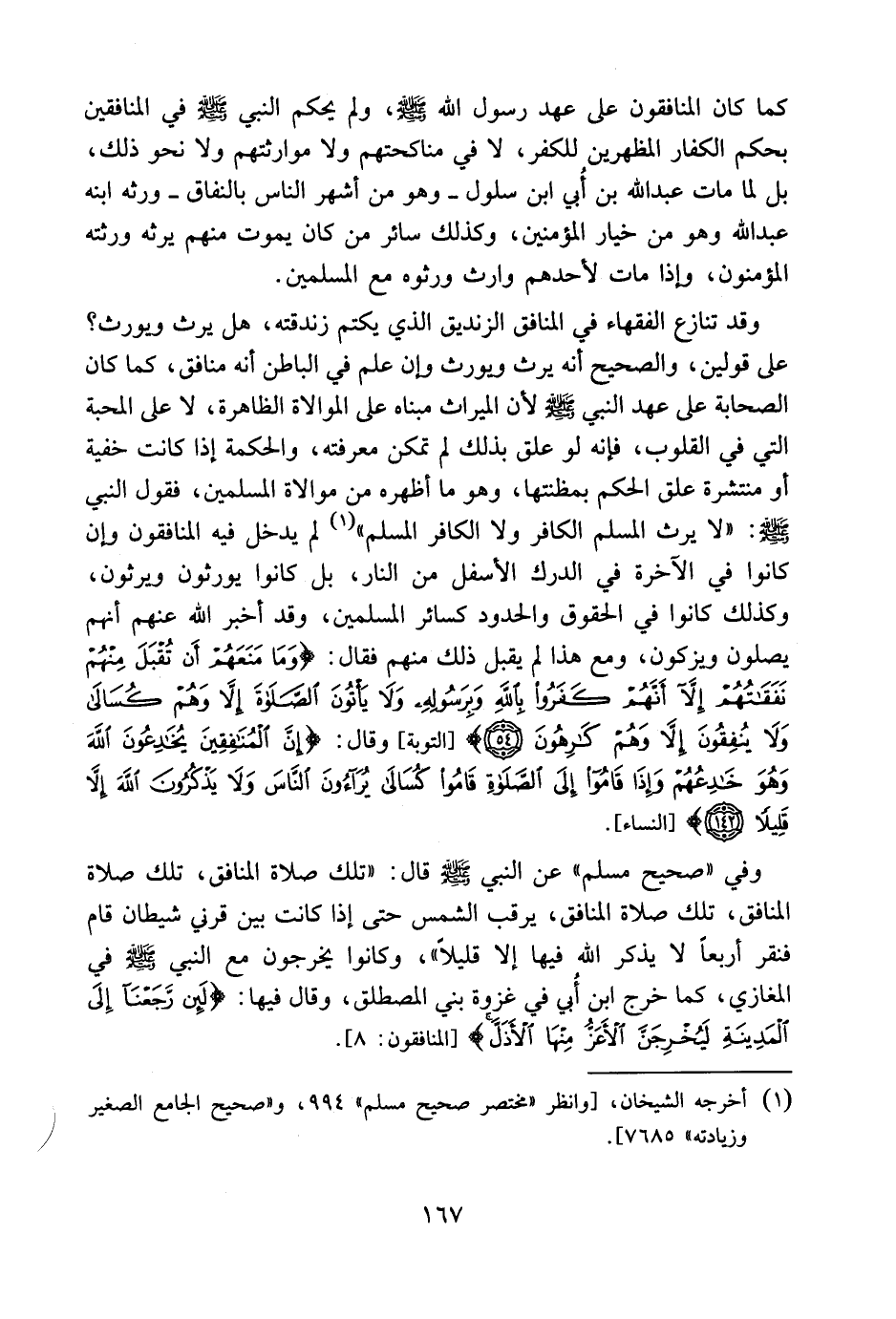 وقد تنازع الفقهاء في المنافق الزنديق الذي يكتم زندقته، هل يَرِث ويُورَث؟ على قولين، والصحيح: أنه يرث ويُورَث وإن علم في الباطن أنه منافق، كما كان الصحابة على عهد النبي صلىالله عليه وسلم؛ لأن الميراث مبناه على الموالاة الظاهرة، لا على المحبة التي في القلوب، فإنه لو علق بذلك لم تمكن معرفته، والحكمة إذا كانت خفية أو منتشرة علق الحكم بمظنتها، وهو ما أظهره من موالاة المسلمين فقول النبي صلىالله عليه وسلم: " لا يرث المسلم الكافر ولا الكافر المسلم " لم يدخل فيه المنافقون وإن كانوا في الآخرة في الدرك الأسفل من النار، بل كانوا يُورَثون ويَرِثون، وكذلك كانوا في الحقوق والحدود كسائر المسلمين، وقد أخبر الله عنهم أنهم يصلون ويزكون ومع هذا لم يقبل ذلك منهم فقال: {وَمَا مَنَعَهُمْ أَن تُقْبَلَ مِنْهُمْ نَفَقَاتُهُمْ إِلاَّ أَنَّهُمْ كَفَرُواْ بِاللهِ وَبِرَسُولِهِ وَلاَ يَأْتُونَ الصَّلاَةَ إِلاَّ وَهُمْ كُسَالَى وَلاَ يُنفِقُونَ إِلاَّ وَهُمْ كَارِهُونَ} [التوبة: 54] ، وقال: {إِنَّ الْمُنَافِقِينَ يُخَادِعُونَ اللهَ وَهُوَ خَادِعُهُمْ وَإِذَا قَامُواْ إِلَى الصَّلاَةِ قَامُواْ كُسَالَى يُرَآؤُونَ النَّاسَ وَلاَ يَذْكُرُونَ اللهَ إِلاَّ قَلِيلاً} [النساء: 142] . وفي صحيح مسلم عن النبي صلى الله عليه وسلم قال: " تلك صلاة المنافق، تلك صلاة المنافق، تلك صلاة المنافق، يَرْقُب الشمسَ حتى إذا كانت بين قَرْنَي شيطان قام فَنَقَرَ أربعاً لا يذكر الله فيها إلا قليلاً "، وكانوا يخرجون مع النبي صلىالله عليه وسلم في المغازي، كما خرج ابن أُبَي في غزوة بني المُصْطَلقَ، وقال فيها: {لَئِن رَّجَعْنَا إِلَى الْمَدِينَةِ لَيُخْرِجَنَّ الْأَعَزُّ مِنْهَا الأَذَلَّ} [المنافقون: 8] .