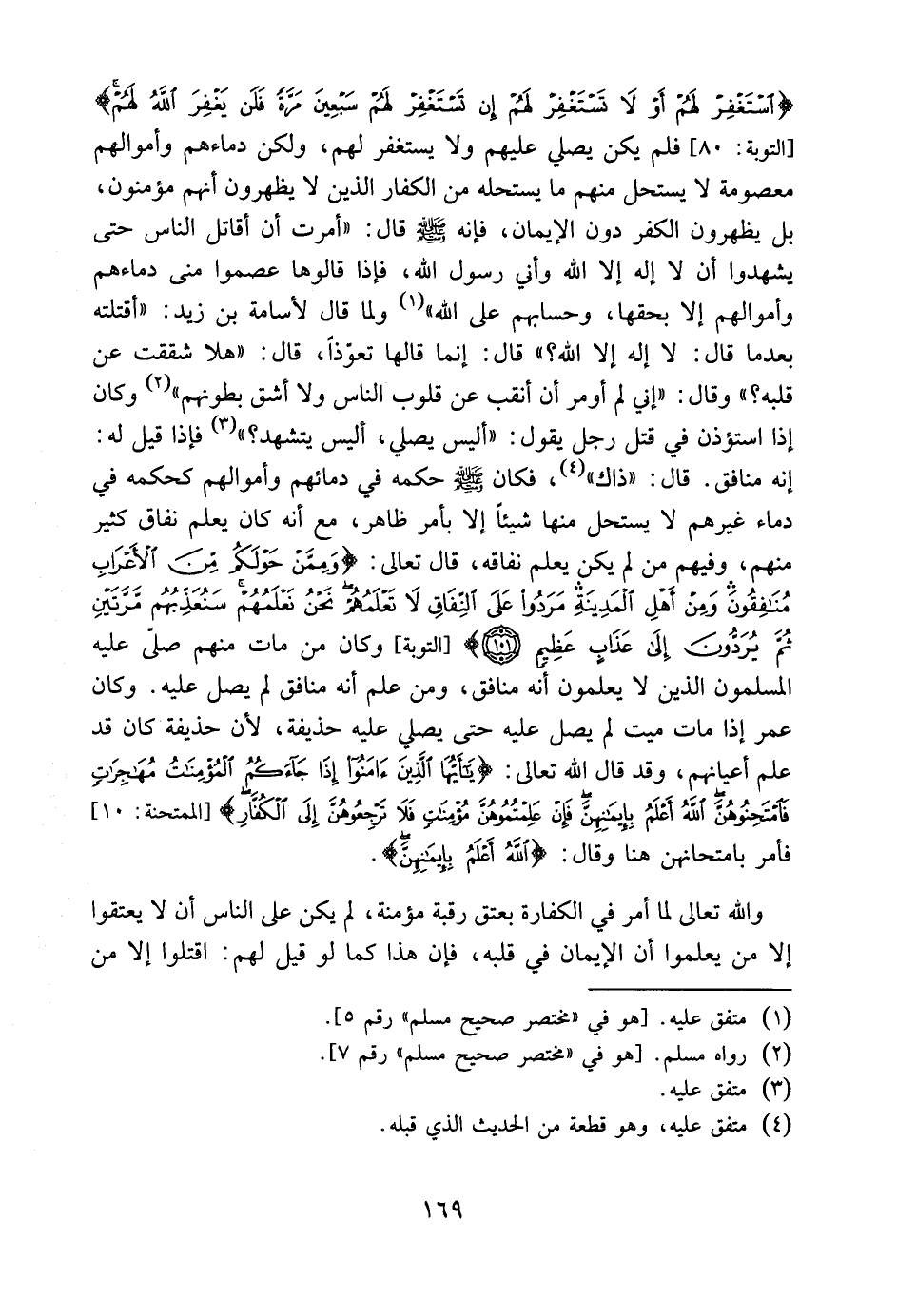 {اسْتَغْفِرْ لَهُمْ أَوْ لاَ تَسْتَغْفِرْ لَهُمْ إِن تَسْتَغْفِرْ لَهُمْ سَبْعِينَ مَرَّةً فَلَن يَغْفِرَ اللهُ لَهُمْ} [التوبة: 80] ، فلم يكن يصلى عليهم ولا يستغفر لهم، ولكن دماؤهمْ وأموالهم معصومة لا يستحل منهم ما يستحله من الكفار الذين لا يظهرون أنهم مؤمنون، بل يظهرون الكفر دون الإيمان، فإنه صلىالله عليه وسلم قال: " أمرت أن أقاتل الناس حتى يشهدوا أن لا إله إلا الله وأني رسول الله، فإذا قالوها عَصَمُوا مني دماءهم وأموالهم إلا بحقها، وحسابهم على اللّّه "، ولما قال لأسامة ابن زيد: " أقتلته بعد ما قال: لا إله إلا الله؟ " قال: إنما قالها تَعَوُّذاً. قال: " هَلاَّ شَقَقْتَ عن قلبه؟ " وقال: " إني لم أومر أن أنقِّبَ عن قلوب الناس، ولا أشُقَّ بطونهم " وكان إذا استؤذن في قتل رجل يقول: " أليس يصلي، أليس يتشهد؟ " فإذا قيل له: إنه منافق. قال: " ذاك ".
