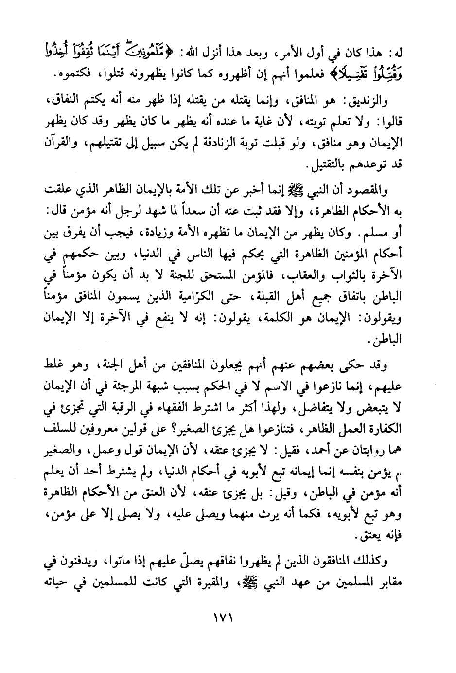 وكذلك المنافقون الذين لم يظهروا نفاقهم، يصلى عليهم إذا ماتوا، ويدفنون في مقابر المسلمين من عهد النبي صلىالله عليه وسلم، والمقبرة التي كانت للمسلمين في حياته