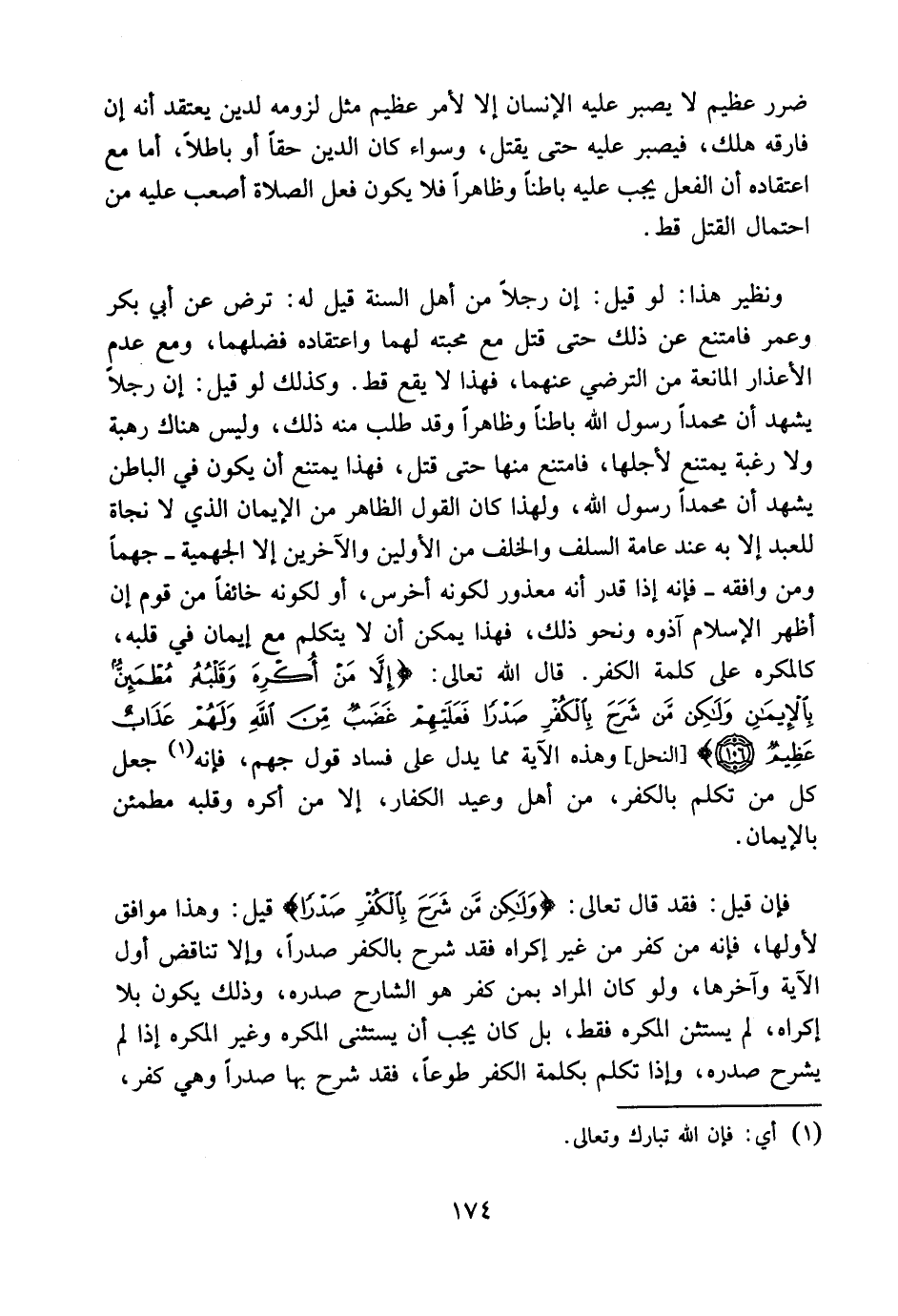 ونظير هذا لو قيل: إن رجلاً من أهل السنة قيل له: تَرَضَّ عن أبي بكر وعمر فامتنع عن ذلك حتى قتل مع محبته لهما واعتقاده فضلهما، ومع عدم الأعذار المانعة من الترضي عنهما، فهذا لا يقع قط. وكذلك لو قيل: إن رجلاً يشهد أن محمداً رسول الله باطنا وظاهراً وقد طلب منه ذلك، وليس هناك رهبة ولا رغبة يمتنع لأجلها، فامتنع منها حتى قتل، فهذا يمتنع أن يكون في الباطن يشهد أن محمداً رسول الله؛ ولهذا كان القول الظاهر من الإيمان الذي لا نجاة للعبد إلا به عند عامة السلف والخلف من الأولين والآخرين إلا الجهمية جَهْماً ومن وافقه فإنه إذا قدر أنه معذور لكونه أخرس، أو لكونه خائفاً من قوم إنأظهر الإسلام آذوه ونحو ذلك، فهذا يمكن ألا يتكلم مع إيمان في قلبه، كالمكره على كلمة الكفر، قال الله تعالى: {إِلاَّ مَنْ أُكْرِهَ وَقَلْبُهُ مُطْمَئِنٌّ بِالإِيمَانِ وَلَكِن مَّن شَرَحَ بِالْكُفْرِ صَدْرًا فَعَلَيْهِمْ غَضَبٌ مِّنَ اللهِ وَلَهُمْ عَذَابٌ عَظِيمٌ} [النحل: 106] وَهذه الآية مما يدل على فساد قول جهم ومن اتبعه، فإنه جعل كل من تكلم بالكفر من أهل وعيد الكفار، إلا من أكره وقلبه مطمئن بالإيمان.
