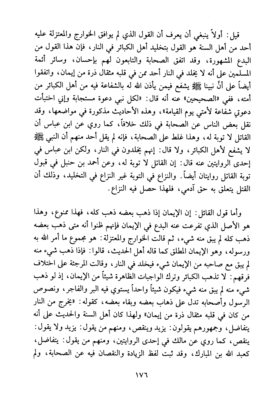 وأما قول القائل: إن الإيمان إذا ذهب بعضه ذهب كله، فهذا ممنوع. وهذا هو الأصل الذي تفرعت عنه البدع في الإيمان، فإنهم ظنوا أنه متى ذهب بعضه ذهب كله لم يبق منه شيء ثم قالت الخوارج والمعتزلة: هو مجموع ما أمر الله به ورسوله، وهوالإيمان المطلق كما قاله أهل الحديث؛ قالوا: فإذا ذهب شيء منه لم يبق مع صاحبه من الإيمان شيء فيخلد في النار. وقالت المرجئة على اختلاف فرقهم: لا تذهب الكبائر وترك الواجبات الظاهرة شيئًا من الإيمان؛ إذ لو ذهب شيء منه لم يبق منه شيء فيكون شيئًا واحداً يستوى فيه البر والفاجر. ونصوص الرسول وأصحابه تدل على ذهاب بعضه وبقاء بعضه، كقوله: " يخرج من النار من كان في قلبه مثقال ذرة من إيمان ".