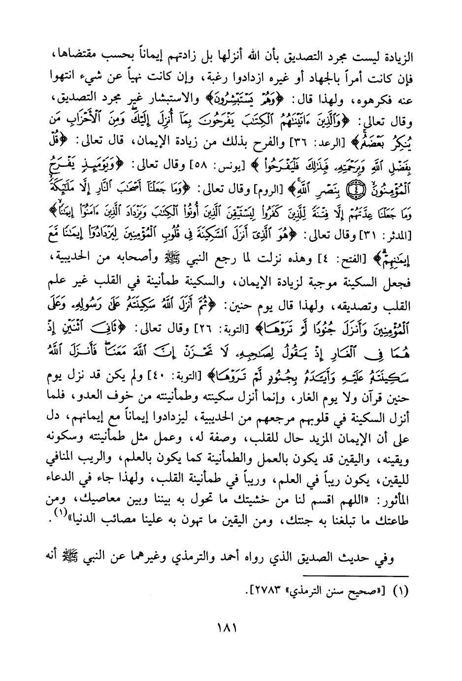 والسكينة طمأنينة في القلب غير علم القلب وتصديقه؛ ولهذا قال يوم حُنَيْنٍ: {ثُمَّ أَنَزلَ اللهُ سَكِينَتَهُ عَلَى رَسُولِهِ وَعَلَى الْمُؤْمِنِينَ وَأَنزَلَ جُنُودًا لَّمْ تَرَوْهَا} [التوبة: 26] ، وقال تعالى: {ثَانِيَ اثْنَيْنِ إِذْ هُمَا فِي الْغَارِ إِذْ يَقُولُ لِصَاحِبِهِ لاَ تَحْزَنْ إِنَّ اللهَ مَعَنَا فَأَنزَلَ اللهُ سَكِينَتَهُ عَلَيْهِ وَأَيَّدَهُ بِجُنُودٍ لَّمْ تَرَوْهَا} [التوبة: 40] ، ولم يكن قد نزل يوم حنين قرآن ولا يوم الغار، وإنما أنزل سكينته وطمأنينته من خوف العدو، فلما أنزل السكينة في قلوبهم، مرجعهم من الحديبية، ليزدادوا إيماناً مع إيمانهم، دل على أن الإيمان المزيد حال للقلب وصفة له، وعمل مثل طمأنينته وسكونه ويقينه، واليقين قد يكون بالعمل والطمأنينة، كما يكون بالعلم، والريب المنافي لليقين يكون ريباً في العلم، وريباً في طمأنينة القلب؛ ولهذا جاء في الدعاء المأثور: " اللهم اقسم لنا من خَشْيَتِك ما تَحُول به بيننا وبين مَعَاصِيكَ، ومن طاعتك ما تُبَلِّغُنَا به جَنّتَكَ، ومن اليقين ما تُهَوِّنُ به علينا مصائب الدنيا ". وفي حديث الصديق الذي رواه أحمد والترمذي وغيرهما عن النبي صلىالله عليه وسلم أنه