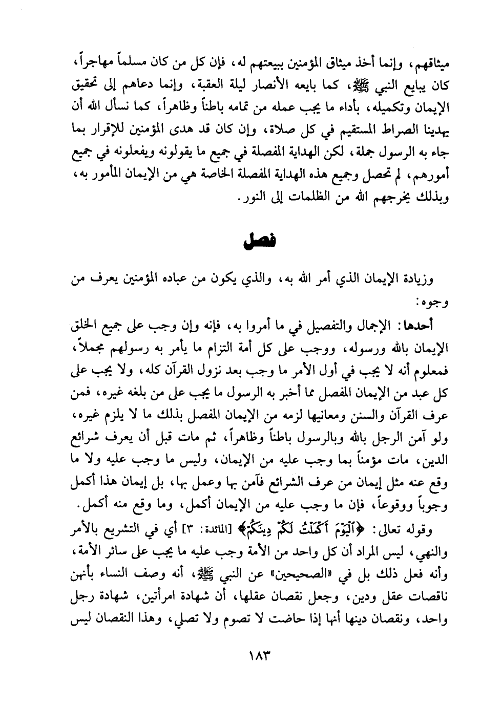 أحدها: الإجمال والتفصيل فيما أمروا به، فإنه وإن وجب على جميع الخلق الإيمان بالله ورسوله، ووجب على كل أمة التزام ما يأمر به رسولهم مجملاً، فمعلوم أنه لا يجب في أول الأمر ما وجب بعد نزول القرآن كله، ولا يجب على كل عبد من الإيمان المفصل مما أخبر به الرسول، ما يجب على من بلغه غيره، فمن عرف القرآن والسنن ومعانيها، لزمه من الإيمان المفصل بذلك ما لا يلزم غيره، ولو آمن الرجل بالله وبالرسول باطناً وظاهراً، ثم مات قبل أن يعرف شرائع الدين، مات مؤمناً بما وجب عليه من الإيمان، وليس ما وجب عليه ولا ما وقع عنه مثل إيمان من عرف الشرائع فآمن بها وعمل بها، بل إيمان هذا أكمل وجوباً ووقوعاً، فإن ما وجب عليه من الإيمان أكمل، وما وقع منه أكمل.