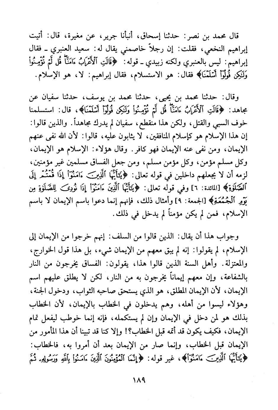 قال محمد بن نصر: حدثنا إسحاق، أنبأنا جَرِير، عن مُغِيرة، قال: أتيت إبراهيم النَّخَعِي، فقلت: إن رجلاً خاصمني يقال له: سعيد العَنْبَرِيّ، فقال إبراهيم: ليس بالعنبري ولكنه زُبٍيْدِيّ. قوله: {قَالَتِ الأَعْرَابُ آمَنَّا قُل لَّمْ تُؤْمِنُوا وَلَكِن قُولُوا أَسْلَمْنَا} [الحجرات: 14] فقال: هو الاستسلام، فقال إبراهيم: لا، هو الإسلام.