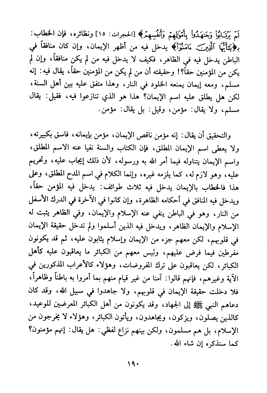 ثم قد يكونون مفرطين فيما فرض عليهم، وليس معهم من الكبائر ما يعاقبون عليه كأهل الكبائر، لكن يعاقبون على ترك المفروضات، وهؤلاء كالأعراب المذكورين في الآية وغيرهم، فإنهم قالوا: آمنا، من غير قيام منهم بما أمروا به باطناً وظاهراً. فلا دخلت حقيقة الإيمان في قلوبهم، ولا جاهدوا في سبيل الله، وقد كان دعاهم النبي صلى الله عليه وسلم إلى الجهاد وقد يكونون من أهل الكبائر المعرضين للوعيد، كالذين يصلون ويزكون ويجاهدون، ويأتون الكبائر، وهؤلاء لا يخرجون من الإسلام، بل هم مسلمون ولكن بينهم نزاع لفظي: هل يقال: إنهم مؤمنون، كما سنذكره إن شاء الله؟