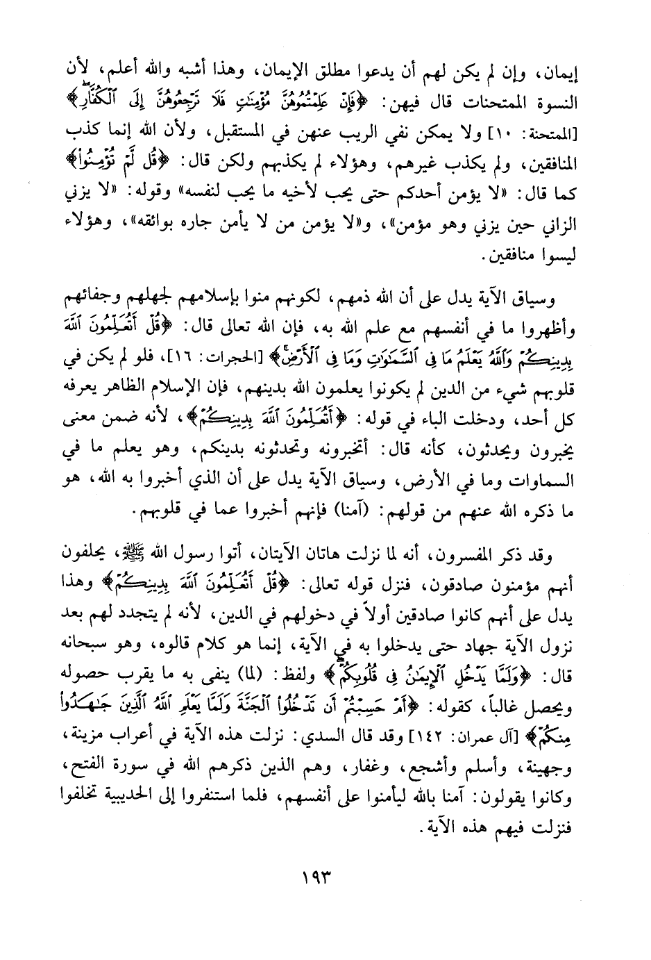 إيمان وإن لم يكن لهم أن يدعوا مطلق الإيمان، وهذا أشبه والله أعلم لأن النسوة الممتحنات قال فيهن: {فَإِنْ عَلِمْتُمُوهُنَّ مُؤْمِنَاتٍ فَلَا تَرْجِعُوهُنَّ إِلَى الْكُفَّارِ} [الممتحنة: 10] ، ولا يمكن نفي الرِّيبِ عنهن في المستقبل، ولأن الله إنما كذب المنافقين ولم يكذب غيرهم، وهؤلاء لم يكذبهم ولكن قال: {لَّمْ تُؤْمِنُوا} كما قال: " لا يؤمن أحدُكُمْ حتى يحب لأخيه ما يُحِبُّ لنفسه "، وقوله: " لا يزني الزاني حين يزني وهومؤمن "، و " لا يؤمن من لا يأمن جاره بَوَائِقَهُ " وهؤلاء ليسوا منافقين.
