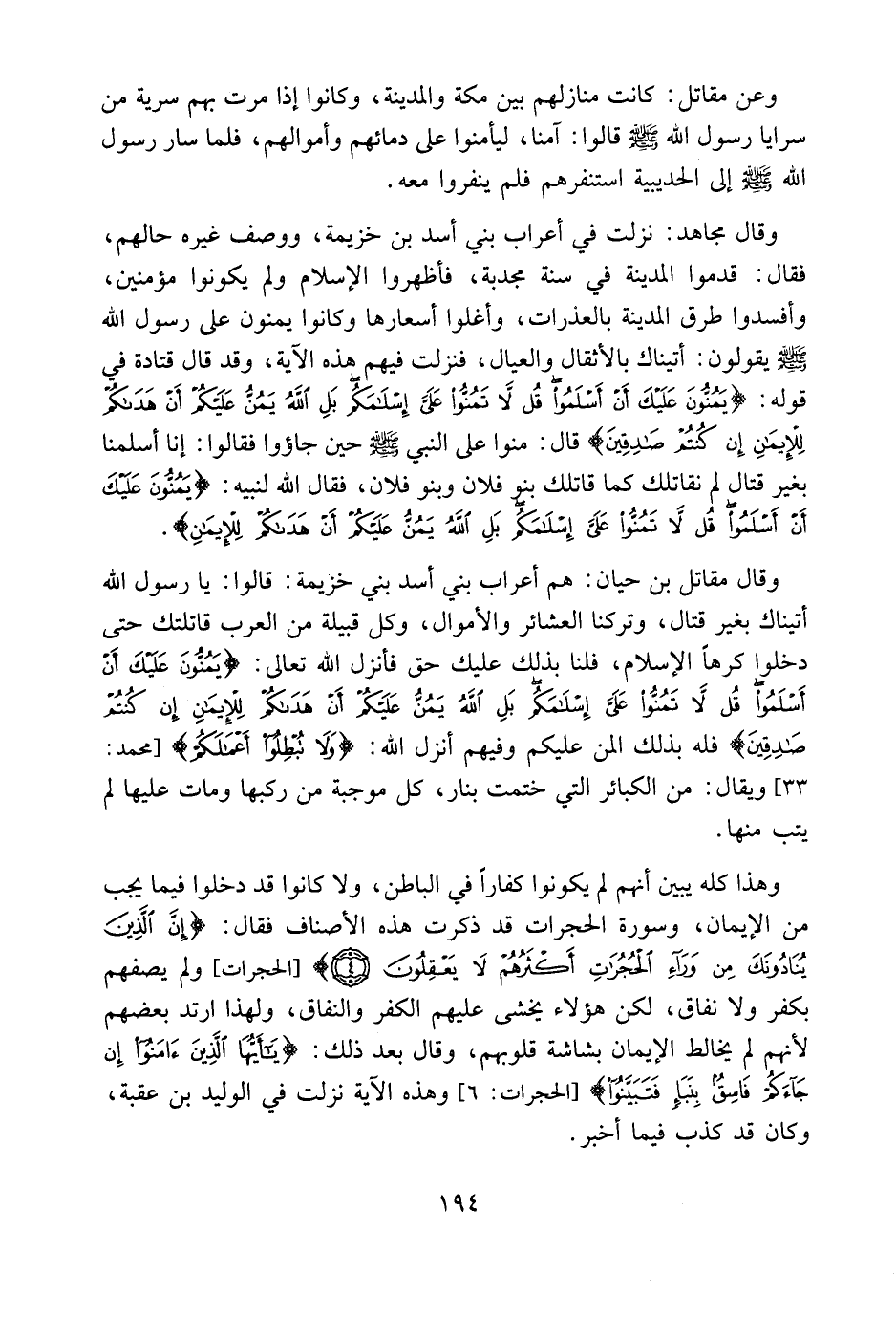 وقال مُقاتِل بن حَيَّان: هم أعراب بني أسد بن خزيمة، قالوا: يا رسول الله، أتيناك بغير قتال، وتركنا العشائر والأموال، وكل قبيلة من العرب قاتلتك حتى دخلوا كرها في الإسلام، فلنا بذلك عليك حق، فأنزل الله تعالى: {يَمُنُّونَ عَلَيْكَ أَنْ أَسْلَمُوا قُل لا تَمُنُّوا عَلَيَّ إِسْلَامَكُم بَلِ اللَّهُ يَمُنُّ عَلَيْكُمْ أَنْ هَدَاكُمْ لِلإِيمَانِ إِن كُنتُمْ صَادِقِينَ} فله بذلك المن عليكم، وفيهم أنزل الله: {وَلا تُبْطِلُوا أَعْمَالَكُمْ} [محمد: 33] ، ويقال: من الكبائر التي ختمت بنار، كل موجبة من ركبها ومات عليها لم يتب منها.