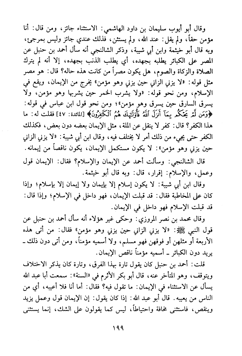 وقال أبو أيوب سليمان بن داود الهاشمي: الاستثناء جائز، ومن قال: أنا مؤمن حقاً، ولم يقل: عند الله، ولم يستثن، فذلك عندي جائز وليس بمرجئ، وبه قال أبو خَيْثَمَة وابن أبي شيبة، وذكر الشالنجي أنه سأل أحمد بن حنبل عن المُصِرِّ على الكبائر يطلبها بجهده، أي: يطلب الذنب بجهده، إلا أنه لم يترك الصلاة والزكاة والصوم؛ هل يكون مصراً من كانت هذه حاله؟ قال: هو مصر مثل قوله: " لا يزني الزاني حين يزني وهو مؤمن " يخرج من الإيمان، ويقع في الإسلام، ومن نحو قوله: " ولا يشرب الخمر حين يشربها وهو مؤمن، ولا يسرق السارق حين يسرق وهو مؤمن " ومن نحو قول ابن عباس في قوله: {وَمَن لَّمْ يَحْكُم بِمَا أَنزَلَ اللهُ فَأُوْلَئِكَ هُمُ الْكَافِرُونَ} [المائدة: 44] ، فقلت له: ما هذا الكفر؟ قال: كفر لا ينقل عن الملة، مثل الإيمان بعضه دون بعض، فكذلك الكفر حتى يجيء من ذلك أمر لا يختلف فيه. وقال ابن أبي شيبة: " لا يزني الزاني حين يزني وهو مؤمن " لا يكون مستكمل الإيمان، يكون ناقصاً من إيمانه.