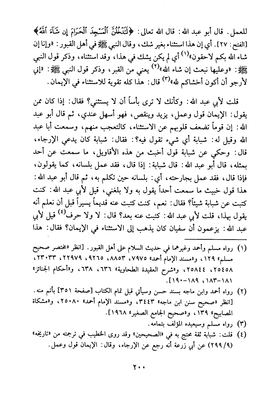 للعمل. قال أبو عبد الله: قال الله تعالى: {لَتَدْخُلُنَّ الْمَسْجِدَ الْحَرَامَ إِن شَاء اللَّهُ آمِنِينَ} [الفتح: 27] أي: أن هذا استثناء بغير شك، وقال النبي صلى الله عليه وسلم في أهل القبور: " وإنَّا إن شاء الله بكم لاحقون " أي: لم يكن يشك في هذا، وقد استثناه وذكر قول النبي صلى الله عليه وسلم: " وعليها نُبْعَثُ إن شاء الله ": يعني: من القبر، وذكر قول النبي صلى الله عليه وسلم: " إني لأرجو أن أكون أخشاكم لله " قال: هذا كله تقوية للاستثناء في الإيمان.