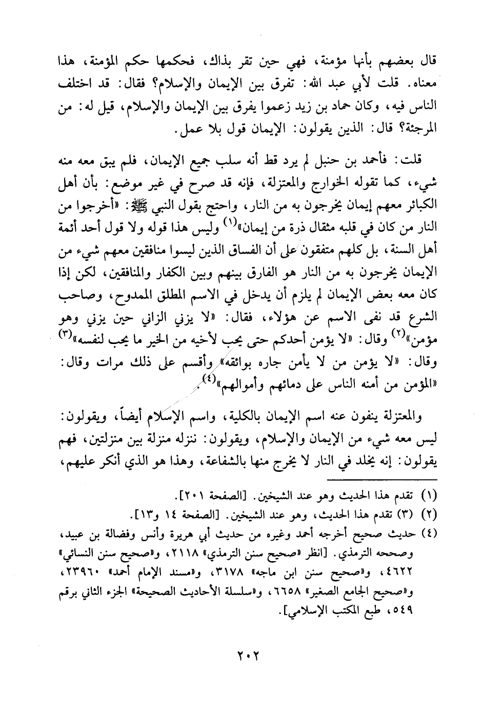 قلت: فأحمد بن حنبل لم يرد قط أنه سلب جميع الإيمان فلم يبق معه منه شيء، كما تقوله الخوارج والمعتزلة، فإنه قد صرح في غير موضع بأن أهل الكبائر معهم إيمان يخرجون به من النار، واحتج بقول النبي صلى الله عليه وسلم: " أخرجوا من النار من كان في قلبه مثقال ذرة من إيمان "، وليس هذا قوله ولا قول أحد من أئمة أهل السنة، بل كلهم متفقون على أن الفُسَّاق الذين ليسوا منافقين معهم شيء من الإيمان يخرجون به من النار، هو الفارق بينهم وبين الكفار والمنافقين، لكن إذا كان معه بعض الإيمان لم يلزم أن يدخل في الاسم المطلق الممدوح، وصاحب الشرع قد نفى الاسم عن هؤلاء فقال: " لا يرني الزاني حين يزني وهو مؤمن "، وقال: " لا يؤمن أحدكم حتي يحب لأخيه من الخير ما يحب لنفسه " وقال: " لا يؤمن من لا يأمن جاره بَوَائِقَه " وأقسم على ذلك مرات وقال: " المؤمن من أمنه الناس على دمائهم وأموالهم "
