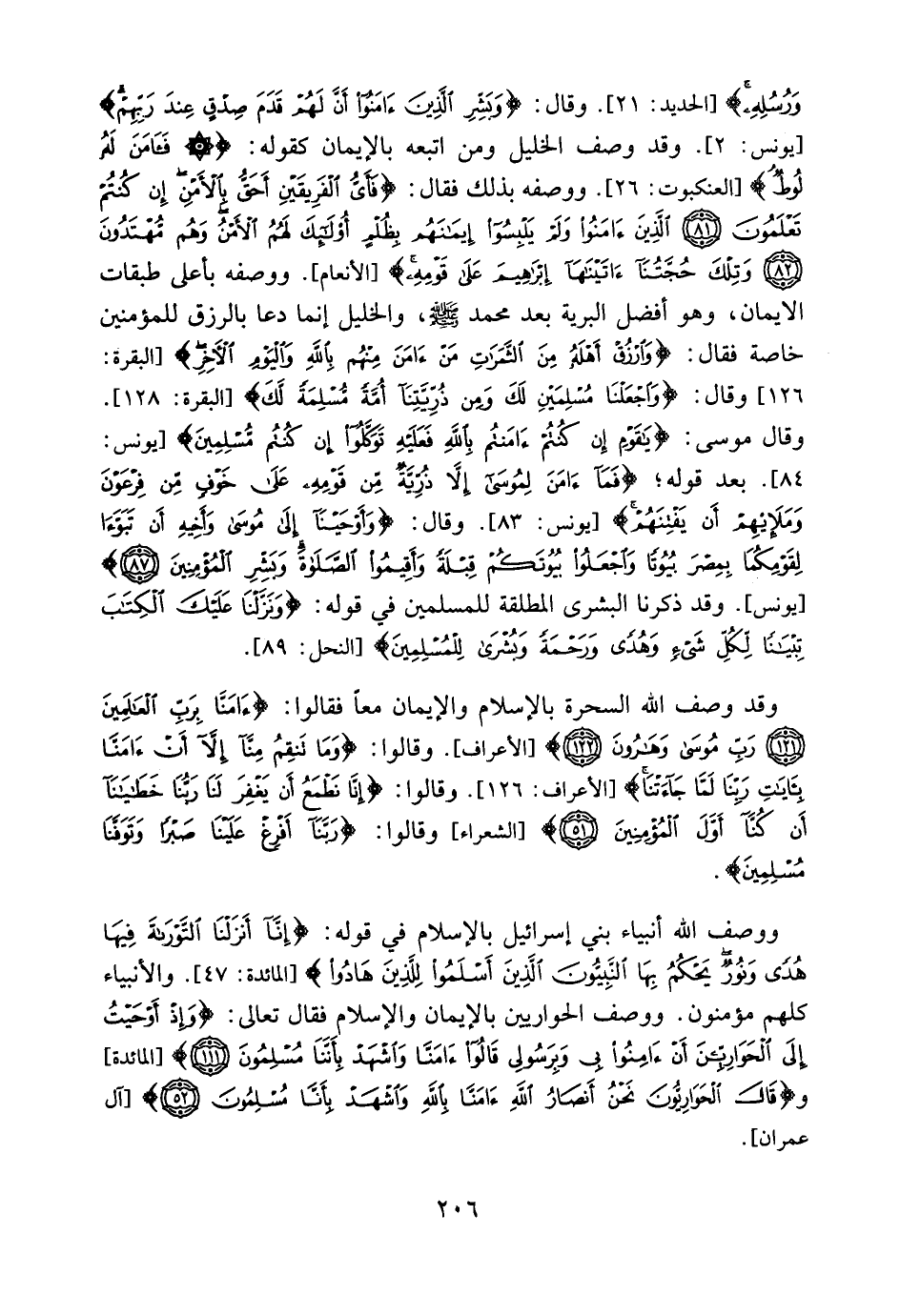 وَرُسُلِهِ} [الحديد: 12] ، وقال: {وَبَشِّرِ الَّذِينَ آمَنُواْ أَنَّ لَهُمْ قَدَمَ صِدْقٍ عِندَ رَبِّهِمْ} [يونس: 2] . وقد وصف الخليل ومن اتبعه بالإيمان كقوله: {فَآمَنَ لَهُ لُوطٌ} [العنكبوت: 26] ، ووصفه بذلك فقال: {فَأَيُّ الْفَرِيقَيْنِ أَحَقُّ بِالأَمْنِ إِن كُنتُمْ تَعْلَمُونَ الَّذِينَ آمَنُواْ وَلَمْ يَلْبِسُواْ إِيمَانَهُم بِظُلْمٍ أُوْلَئِكَ لَهُمُ الأَمْنُ وَهُم مُّهْتَدُونَ وَتِلْكَ حُجَّتُنَا آتَيْنَاهَا إِبْرَاهِيمَ عَلَى قَوْمِهِ} [الأنعام: 81: 83] ، ووصفه بأعلى طبقات الإيمان، وهو أفضل البرية بعد محمد صلى الله عليه وسلم. والخليل إنما دعا بالرزق للمؤمنين خاصة فقال: {وَارْزُقْ أَهْلَهُ مِنَ الثَّمَرَاتِ مَنْ آمَنَ مِنْهُم بِاللهِ وَالْيَوْمِ الآخِرِ} [البقرة: 126] ، وقال: {وَاجْعَلْنَا مُسْلِمَيْنِ لَكَ وَمِن ذُرِّيَّتِنَا أُمَّةً مُّسْلِمَةً لَّكَ} [البقرة: 128] {وَقَالَ مُوسَى يَا قَوْمِ إِن كُنتُمْ آمَنتُم بِاللهِ فَعَلَيْهِ تَوَكَّلُواْ إِن كُنتُم مُّسْلِمِينَ} [يونس: 84] بعد قوله: {فَمَا آمَنَ لِمُوسَى إِلاَّ ذُرِّيَّةٌ مِّن قَوْمِهِ عَلَى خَوْفٍ مِّن فِرْعَوْنَ وَمَلَئِهِمْ أَن يَفْتِنَهُمْ} [يونس: 83] ، وقال: {وَأَوْحَيْنَا إِلَى مُوسَى وَأَخِيهِ أَن تَبَوَّءَا لِقَوْمِكُمَا بِمِصْرَ بُيُوتًا وَاجْعَلُواْ بُيُوتَكُمْ قِبْلَةً وَأَقِيمُواْ الصَّلاَةَ وَبَشِّرِ الْمُؤْمِنِينَ} [يونس: 87] ، وقد ذكرنا البشرى المطلقة للمسلمين في قوله: {وَنَزَّلْنَا عَلَيْكَ الْكِتَابَ تِبْيَانًا لِّكُلِّ شَيْءٍ وَهُدًى وَرَحْمَةً وَبُشْرَى لِلْمُسْلِمِينَ} [النحل: 89] .