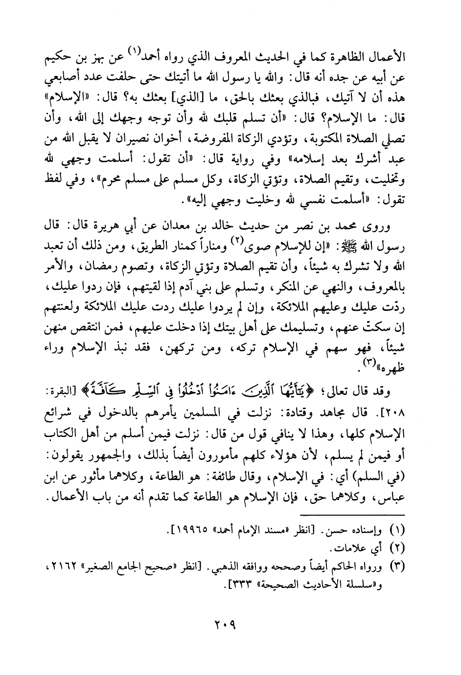 الأعمال الظاهرة، كما في الحديث المعروف الذي رواه أحمد عن بَهْز بن حكيم عن أبيه عن جده؛ أنه قال: والله يا رسول الله، ما أتيتك حتى حلفت عدد أصابعي هذه ألا آتيك، فبالذي بعثك بالحق ما بعثك به؟ قال: " الإسلام ". قال: وما الإسلام؟ قال: " أن تسلم قلبك لله وأن توجه وجهك إلى الله، وأن تصلي الصلاة المكتوبة، وتؤدي الزكاة المفروضة، أخوان نصيران، لا يقبل الله من عبد أشرك بعد إسلامه ". وفي رواية قال: " أن تقول: أسلمت وجهي لله وتخليت، وتقيم الصلاة، وتؤتي الزكاة، وكل مسلم على مسلم مُحَرَّم " وفي لفظ تقول: " أسلمت نفسي لله، وخليت وجهي إليه ". وروى محمد بن نصر من حديث خالد بن معدان عن أبي هريرة قال: قال رسول الله صلى الله عليه وسلم: " إن للإسلام صُوًى ومناراً كمنار الطريق، من ذلك أن تعبد الله ولا تشرك به شيئًا، وأن تقيم الصلاة، وتؤتي الزكاة، وتصوم رمضان، والأمر بالمعروف، والنهي عن المنكر، وتسلم على بني آدم إذا لقيتهم، فإن ردوا عليك، ردت عليك وعليهم الملائكة، وإن لم يردوا عليك ردت عليك الملائكة ولعنتهم إن سَكَتَّ عنهم، وتسليمك على أهل بيتك إذا دخلت عليهم، فمن انتقص منهن شيئًا فهو سهم في الإسلام تركه، ومن تركهن فقد نَبَذَ الإسلام وراء ظهره ".