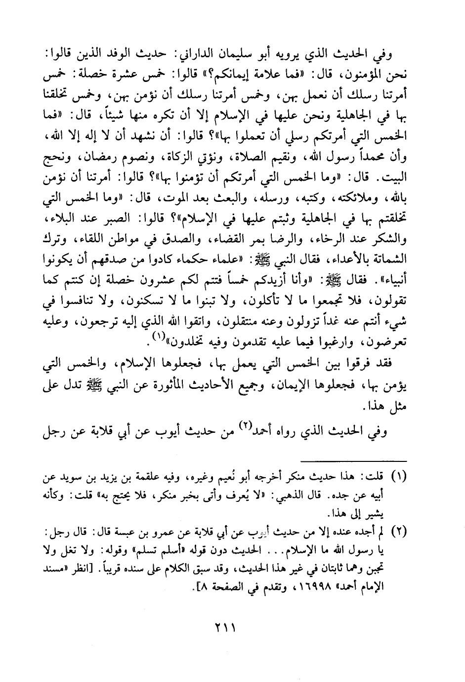 وفي الحديث الذي يرويه أبو سليمان الداراني: حديث الوفد الذين قالوا: نحن المؤمنون، قال: " فما علامة إيمانكم؟ " قالوا: خمس عشرة خَصْلة: خمس أمرتنا رسلك أن نعمل بهن، وخمس أمرتنا رسلك أننؤمن بهن، وخمس تَخَلَّقْنَا بها في الجاهلية، ونحن عليها في الإسلام إلا أن تكره منها شيئًا. قال: " فما الخمس التي أمرتكم رسلي أن تعملوا بها؟ " قالوا: أن نشهد أن لا إله إلا الله، وأن محمداً رسول الله، ونقيم الصلاة، ونؤتي الزكاة، ونصوم رمضان، ونحج البيت. قال: " وما الخمس التي أمرتكم أن تؤمنوا بها؟ " قالوا: أمرتنا أن نؤمن بالله، وملائكته، وكتبه، ورسله، والبعث بعد الموت، قال: " وما الخمس التي تخلقتم بها في الجاهلية، وثَبَتُّمْ عليها في الإسلام؟ " قالوا: الصبر عند البَلاء، والشكر عند الرَّخَاء والرِّضَي بِمُرِّ القضاء، والصدق في مواطن اللقاء، وترك الشماتة بالأعداء"، فقال النبي صلى الله عليه وسلم: " علماء حكماء، كادوا من صِدْقِهم أن يكونوا أنبياء ". فقال صلىالله عليه وسلم: " وأنا أزيدكم خمسًا فتتم لكم عشرون خصلة: إن كنتم كما تقولون، فلا تجمعوا ما لا تأكلون، ولا تبنوا ما لا تسكنون، ولا تنافسوا في شيء أنتم عنه غداً تزولون وعنه منتقلون، واتقوا الله الذي إليه ترجعون، وعليه تعرضون، وارغبوا فيما عليه تقدمون، وفيه تخلدون ".