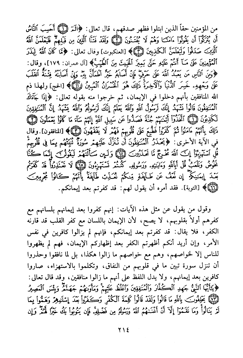 وقول من يقول عن مثل هذه الآيات: إنهم كفروا بعد إيمانهم بلسانهم مع كفرهم أولاً بقلوبهم، لا يصح؛ لأن الإيمان باللسان مع كفر القلب قد قارنه الكفر، فلا يقال: قد كفرتم بعد إيمانكم، فإنهم لم يزالوا كافرين في نفس الأمر، وإن أريد أنكم أظهرتم الكفر بعد إظهاركم الإيمان، فهم لم يظهروا للناس إلا لخواصهم، وهم مع خواصهم مازالوا هكذا، بل لما نافقوا وحذروا أن تنزل سورة تبين ما في قلوبهم من النفاق، وتكلموا بالاستهزاء، صاروا كافرين بعد إيمانهم، ولا يدل اللفظ على أنهم ما زالوا منافقين، وقد قال تعالى: {يَا أَيُّهَا النَّبِيُّ جَاهِدِ الْكُفَّارَ وَالْمُنَافِقِينَ وَاغْلُظْ عَلَيْهِمْ وَمَأْوَاهُمْ جَهَنَّمُ وَبِئْسَ الْمَصِيرُ يَحْلِفُونَ بِاللهِ مَا قَالُواْ وَلَقَدْ قَالُواْ كَلِمَةَ الْكُفْرِ وَكَفَرُواْ بَعْدَ إِسْلاَمِهِمْ وَهَمُّواْ بِمَا لَمْ يَنَالُواْ وَمَا نَقَمُواْ إِلاَّ أَنْ أَغْنَاهُمُ اللهُ وَرَسُولُهُ مِن فَضْلِهِ فَإِن يَتُوبُواْ يَكُ خَيْرًا لَّهُمْ وَإِن