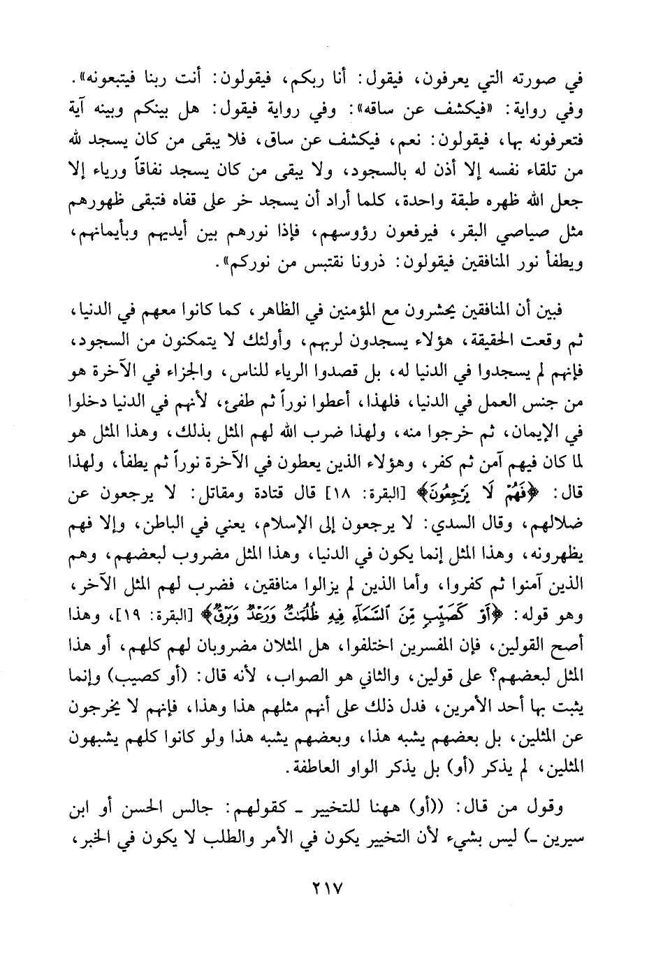 ولهذا قال: {فَهُمْ لاَ يَرْجِعُونَ} [البقرة: 18] إلى الإسلام في الباطن. وقال قتادة ومقاتل: لا يرجعون عن ضلالهم. وقال السدي: لا يرجعون إلى الإسلام، يعني في الباطن، وإلا فهم يظهرونه، وهذا المثل إنما يكون في الدنيا، وهذا المثل مضروب لبعضهم وهم الذين آمنوا ثم كفروا. وأما الذين لم يزالوا منافقين فضرب لهم المثل الآخر، وهو قوله: {أَوْ كَصَيِّبٍ مِّنَ السَّمَاء فِيهِ ظُلُمَاتٌ وَرَعْدٌ وَبَرْقٌ} [البقرة: 19] ، وهذا أصح القولين، فإن المفسرين اختلفوا: هل المثلان مضروبان لهم كلهم، أو هذا المثل لبعضهم؟ على قولين. والثاني هو الصواب؛ لأنه قال: {أَوْ كَصَيِّبٍ} وإنما يثبت بها أحد الأمرين، فدل ذلك على أنهم مثلهم هذا وهذا، فإنهم لا يخرجون عن المثلين بل بعضهم يشبه هذا وبعضهم يشبه هذا، ولو كانوا كلهم يشبهون المثلين لم يذكر [أو] بل يذكر الواو العاطفة.