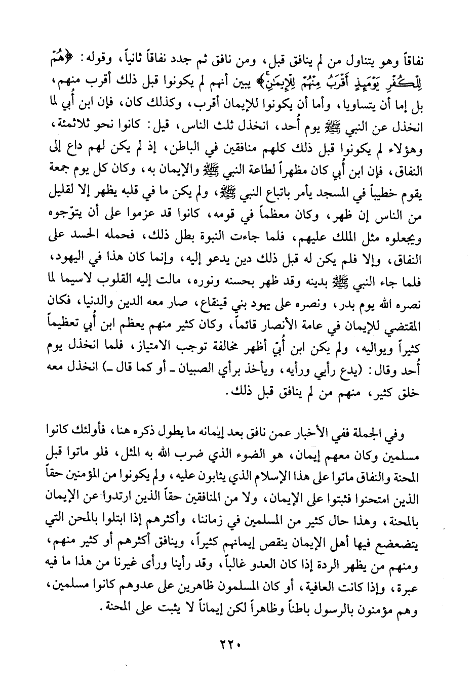 وفي الجملة، ففي الأخبار عمن نافق بعد إيمانه ما يطول ذكره هنا، فأولئك كانوا مسلمين، وكان معهم إيمان، هو الضوء الذي ضرب الله به المثل، فلو ماتوا قبل المحنة والنفاق ماتوا على هذا الإسلام الذي يثابون عليه، ولم يكونوا من المؤمنين حقاً الذين امتحنوا فثبتوا على الإيمان، ولا من المنافقين حقاً الذين ارتدوا عن الإيمان بالمحنة، وهذا حال كثير من المسلمين في زماننا أو أكثرهم، إذا ابتلوا بالمحن التي يتضعضع فيها أهل الإيمان، ينقص إيمانهم كثيراً وينافق أكثرهم أو كثير منهم. ومنهم من يظهر الردة إذا كان العدو غالباً، وقد رأينا ورأى غيرنا من هذا ما فيه عبرة. وإذا كانت العافية، أو كان المسلمون ظاهرين على عدوهم كانوا مسلمين، وهم مؤمنون بالرسول باطناً وظاهراً لكن إيماناً لا يثبت على المحنة.