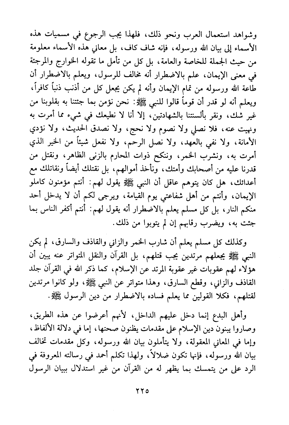 وكذلك كل مسلم يعلم أن شارب الخمر والزاني والقاذف والسارق، لم يكن النبي صلى الله عليه وسلم يجعلهم مرتدين يجب قتلهم، بل القرآن والنقل المتواتر عنه يبين أن هؤلاء لهم عقوبات غير عقوبة المرتد عن الإسلام، كما ذكر الله في القرآن جلد القاذف والزاني، وقطع السارق، وهذا متواتر عن النبي صلى الله عليه وسلم، ولو كانوا مرتدين لقتلهم. فكلا القولين مما يعلم فساده بالاضطرار من دين الرسول صلى الله عليه وسلم.