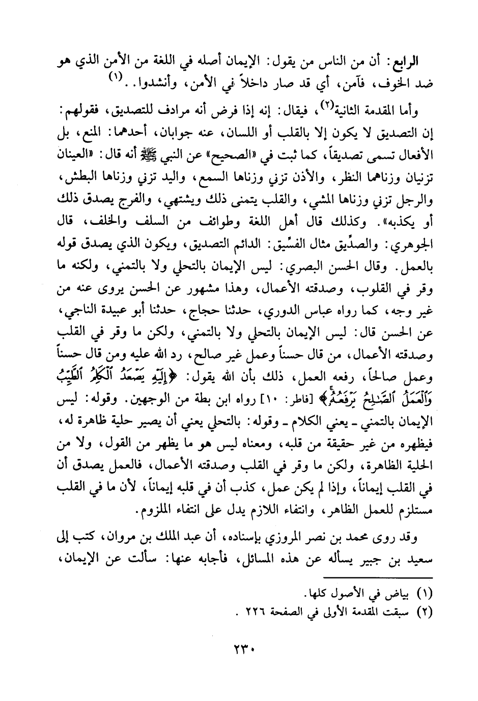 وأما المقدمة الثانية، فيقال: إنه إذا فرض أنه مرادف للتصديق فقولهم: إن التصديق لا يكون إلا بالقلب أو اللسان؛ عنه جوابان: