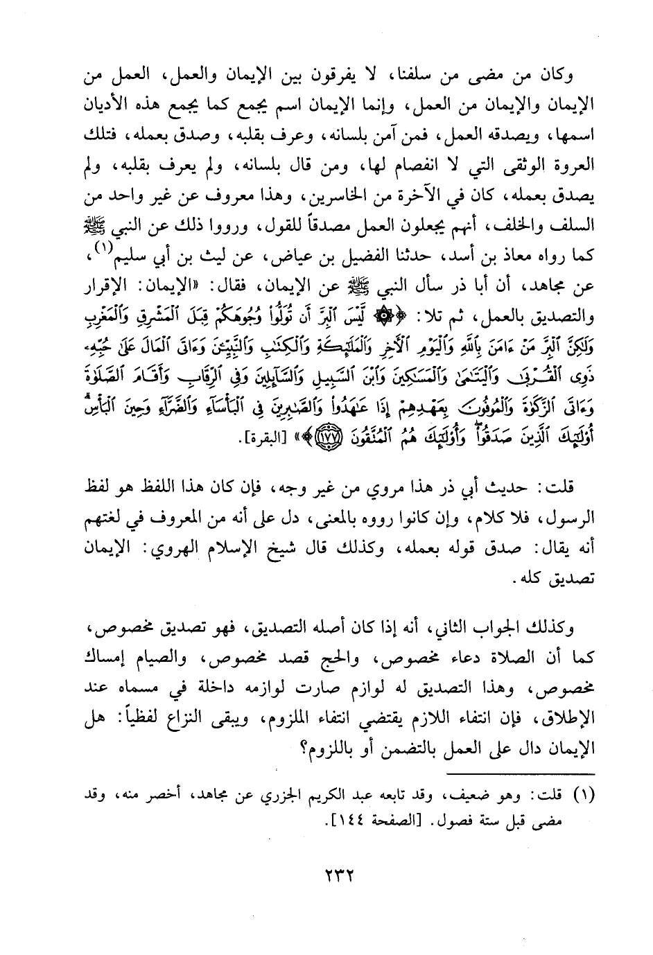 وكان من مضى من سلفنا، لا يفرقون بين الإيمان والعمل، العمل من الإيمان والإيمان من العمل، وإنما الإيمان اسم يجمع كما يجمع هذه الأديان اسمها ويصدقه العمل. فمن آمن بلسانه، وعرف بقلبه، وصدق بعمله، فتلك العروة الوثقى التي لا انفصام لها. ومن قال بلسانه، ولم يعرف بقلبه، ولم يصدق بعمله كان في الآخرة من الخاسرين. وهذا معروف عن غير واحد من السلف والخلف، أنهم يجعلون العمل مصدقاً للقول، ورووا ذلك عن النبي صلى الله عليه وسلم كما رواه معاذ بن أسد: حدثنا الفضيل بن عياض، عن ليث بن أبي سليم، عن مجاهد: أن أبا ذر سأل النبي صلى الله عليه وسلم عن الإيمان. فقال: " الإيمان: الإقرار والتصديق بالعمل "، ثم تلا {لَيْسَ الْبِرَّ أَنْ تُوَلُّوا وُجُوهَكُمْ قِبَلَ الْمَشْرِقِ وَالْمَغْرِبِ وَلَكِنَّ الْبِرَّ مَنْ آمَنَ بِاللَّهِ وَالْيَوْمِ الآخِرِ وَالْمَلائِكَةِ وَالْكِتَابِ وَالنَّبِيِّينَ وَآتَى الْمَالَ عَلَى حُبِّهِ ذَوِي الْقُرْبَى وَالْيَتَامَى وَالْمَسَاكِينَ وَابْنَ السَّبِيلِ وَالسَّائِلِينَ وَفِي الرِّقَابِ وَأَقَامَ الصَّلاةَ وَآتَى الزَّكَاةَ وَالْمُوفُونَ بِعَهْدِهِمْ إِذَا عَاهَدُوا وَالصَّابِرِينَ فِي الْبَأْسَاءِ وَالضَّرَّاءِ وَحِينَ الْبَأْسِ أُولَئِكَ الَّذِينَ صَدَقُوا وَأُولَئِكَ هُمُ الْمُتَّقُونَ} [البقرة: 177] .