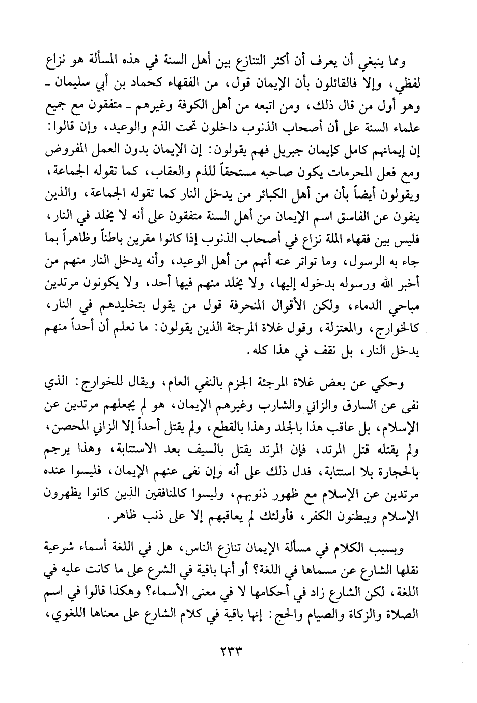 ومما ينبغي أن يعرف: أن أكثر التنازع بين أهل السنة في هذه المسألة هو نزاع لفظي، وإلا فالقائلون بأن الإيمان قول من الفقهاء كحماد بن أبي سليمان وهو أول من قال ذلك، ومن اتبعه من أهل الكوفة وغيرهم متفقون مع جميع علماء السنة على أن أصحاب الذنوب داخلون تحت الذم والوعيد، وإن قالوا: إن إيمانهم كامل كإيمان جبريل، فهم يقولون: إن الإيمان بدون العمل المفروض، ومع فعل المحرمات، يكون صاحبه مستحقاً للذم والعقاب، كما تقوله الجماعة. ويقولون أيضًا بأن من أهل الكبائر من يدخل النار كما تقوله الجماعة، والذين ينفون عن الفاسق اسم الإيمان من أهل السنة متفقون على أنه لا يخلد في النار. فليس بين فقهاء الملة نزاع في أصحاب الذنوب إذا كانوا مقرين باطناً وظاهراً بما جاء به الرسول، وما تواتر عنه أنهم من أهل الوعيد، وأنه يدخل النار منهم من أخبر الله ورسوله بدخوله إليها، ولا يخلد منهم فيها أحد، ولا يكونون مرتدين مباحي الدماء، ولكن الأقوال المنحرفة قول من يقول بتخليدهم في النار، كالخوارج، والمعتزلة. وقول غلاة المرجئة الذين يقولون: ما نعلم أن أحداً منهم يدخل النار، بل نقف في هذا كله. وحكى عن بعض غلاة المرجئة الجزم بالنفي العام.