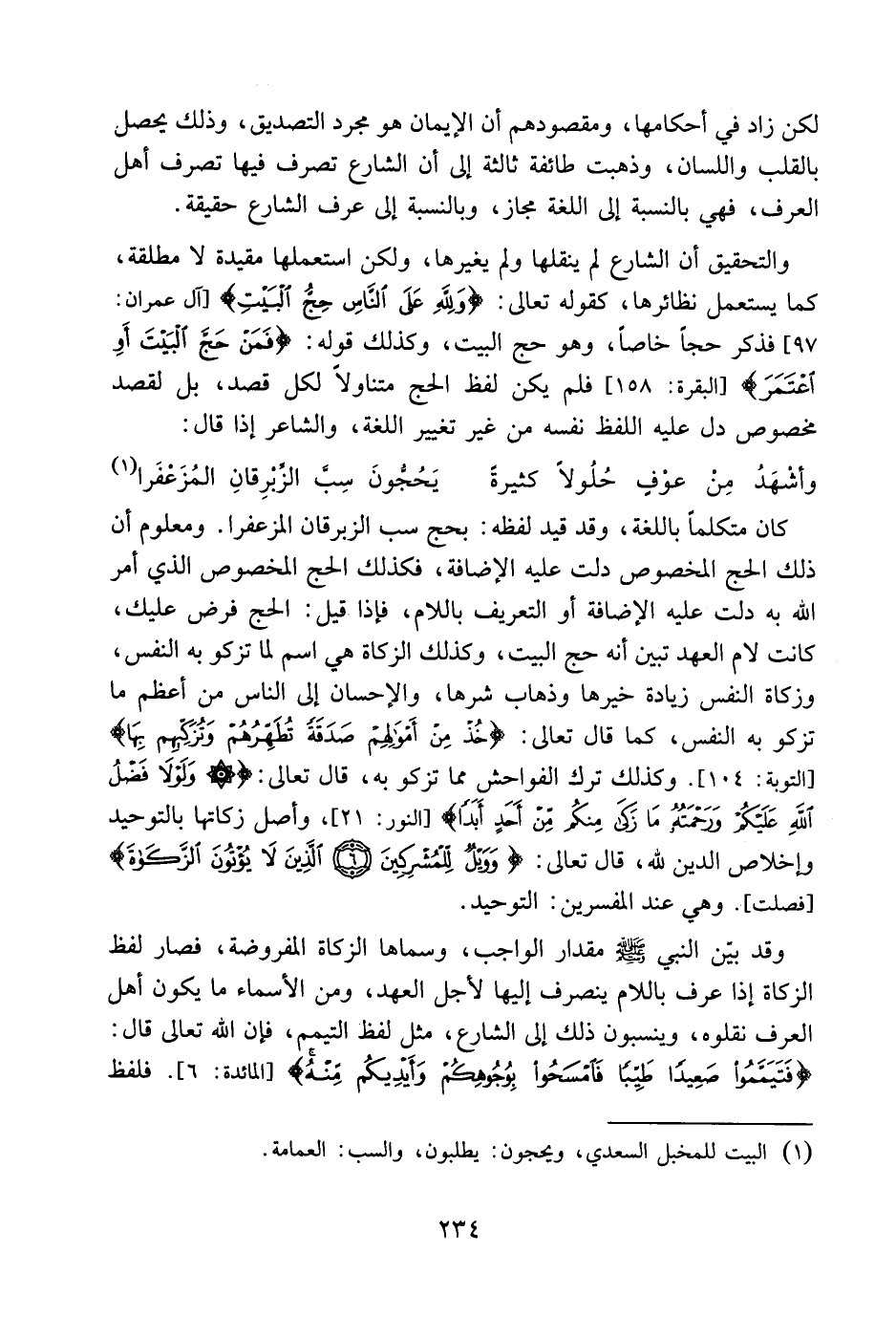 كان متكلماً باللغة، وقد قيد لفظه بحج سب الزبرقان المزعفرا، ومعلوم أن ذلك الحج المخصوص دلت عليه الإضافة، فكذلك الحج المخصوص الذي أمر الله به دلت عليه الإضافة أو التعريف باللام؛ فإذا قيل: الحج فرض عليك، كانت لام العهد تبين أنه حج البيت. وكذلك [الزكاة] هي اسم لما تزكو به النفس، وزكاة النفس زيادة خيرها وذهاب شرها والإحسان إلى الناس من أعظم ما تزكو به النفس، كما قال تعالى: {خُذْ مِنْ أَمْوَالِهِمْ صَدَقَةً تُطَهِّرُهُمْ وَتُزَكِّيهِم بِهَا} [التوبة: 103] . وكذلك ترك الفواحش مما تزكو به، قال تعالى: {وَلَوْلا فَضْلُ اللَّهِ عَلَيْكُمْ وَرَحْمَتُهُ مَا زَكَا مِنكُم مِّنْ أَحَدٍ أَبَدًا} [النور: 21] وأصل زكاتها بالتوحيد وإخلاص الدين لله، قال تعالى: {وَوَيْلٌ لِّلْمُشْرِكِينَ الَّذِينَ لا يُؤْتُونَ الزَّكَاةَ} [فصلت: 6، 7] وهي عند المفسرين التوحيد.