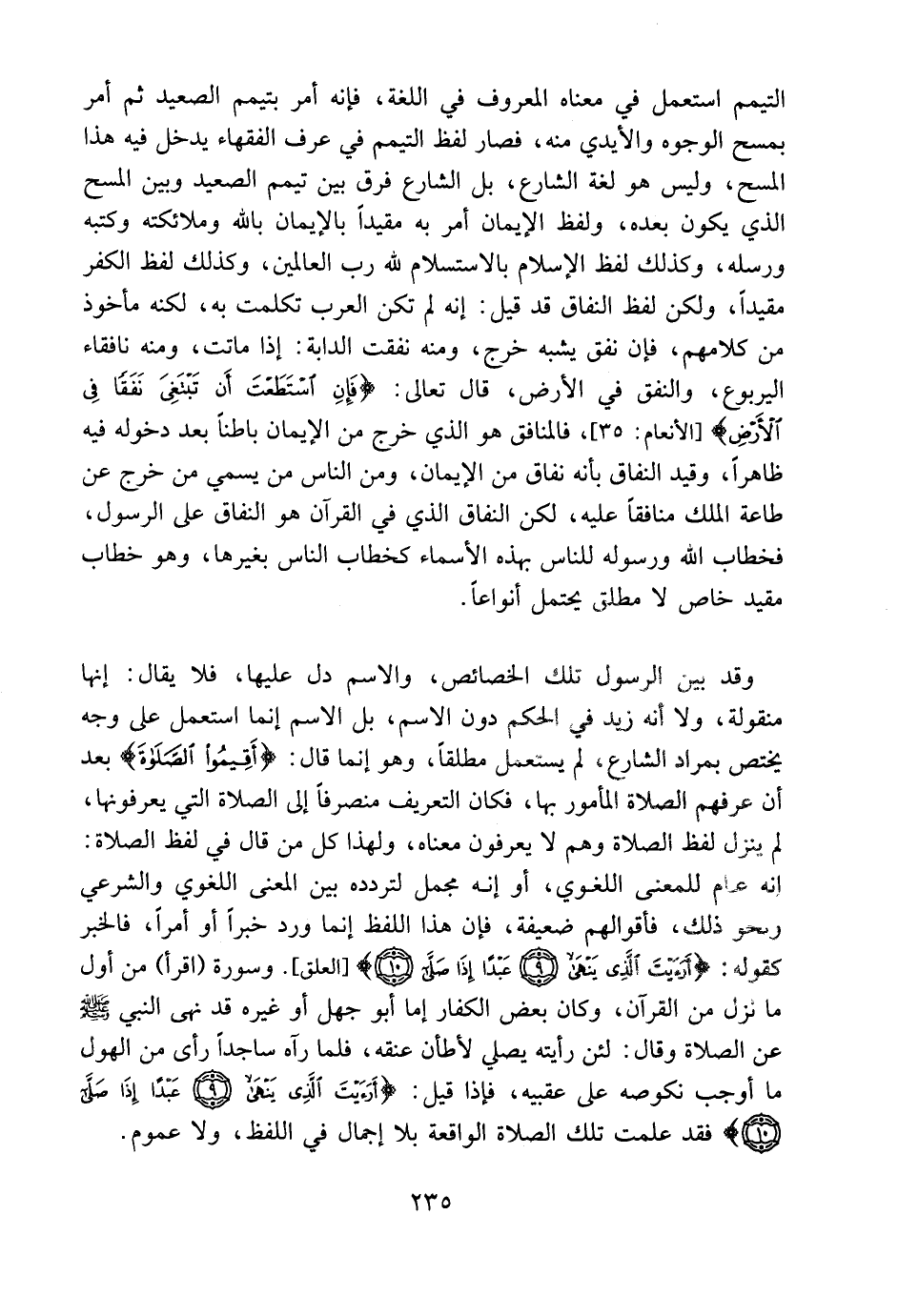 وقد بين الرسول تلك الخصائص، والاسم دل عليها، فلا يقال: إنها منقولة، ولا أنه زيد في الحكم دون الاسم، بل الاسم إنما استعمل على وجه يختص بمراد الشارع، لم يستعمل مطلقاً، وهو إنما قال: {وَأَقِيمُواْ الصَّلاَةَ} [البقرة: 110] ، بعد أن عرَّفهم الصلاة المأمور بها، فكان التعريف منصرفاً إلى الصلاة التي يعرفونها لم يرد لفظ الصلاة وهم لا يعرفون معناه؛ ولهذا كل من قال في لفظ الصلاة: إنه عام للمعني اللغوي، أو إنه مجمل لتردده بين المعنى اللغوي والشرعي ونحو ذلك؛ فأقوالهم ضعيفة، فإن هذا اللفظ إنما ورد خبراً أو أمراً، فالخبر كقوله: {أَرَأَيْتَ الَّذِي يَنْهَى عَبْدًا إِذَا صَلَّى} [العلق: 9، 10] وسورة [اقْرأ] من أول ما نزل من القرآن، وكان بعض الكفار إما أبو جهل أو غيره قد نهى النبي صلى الله عليه وسلم عن الصلاة وقال: لئن رأيته يصلي لأطأن عنقه. فلما رآه ساجداً رأى من الهول ما أوجب نكوصه على عقبيه، فإذا قيل: {أَرَأَيْتَ الَّذِي يَنْهَى عَبْدًا إِذَا صَلَّى} فقد علمت تلك الصلاة الواقعة بلا إجمال في اللفظ ولا عموم.