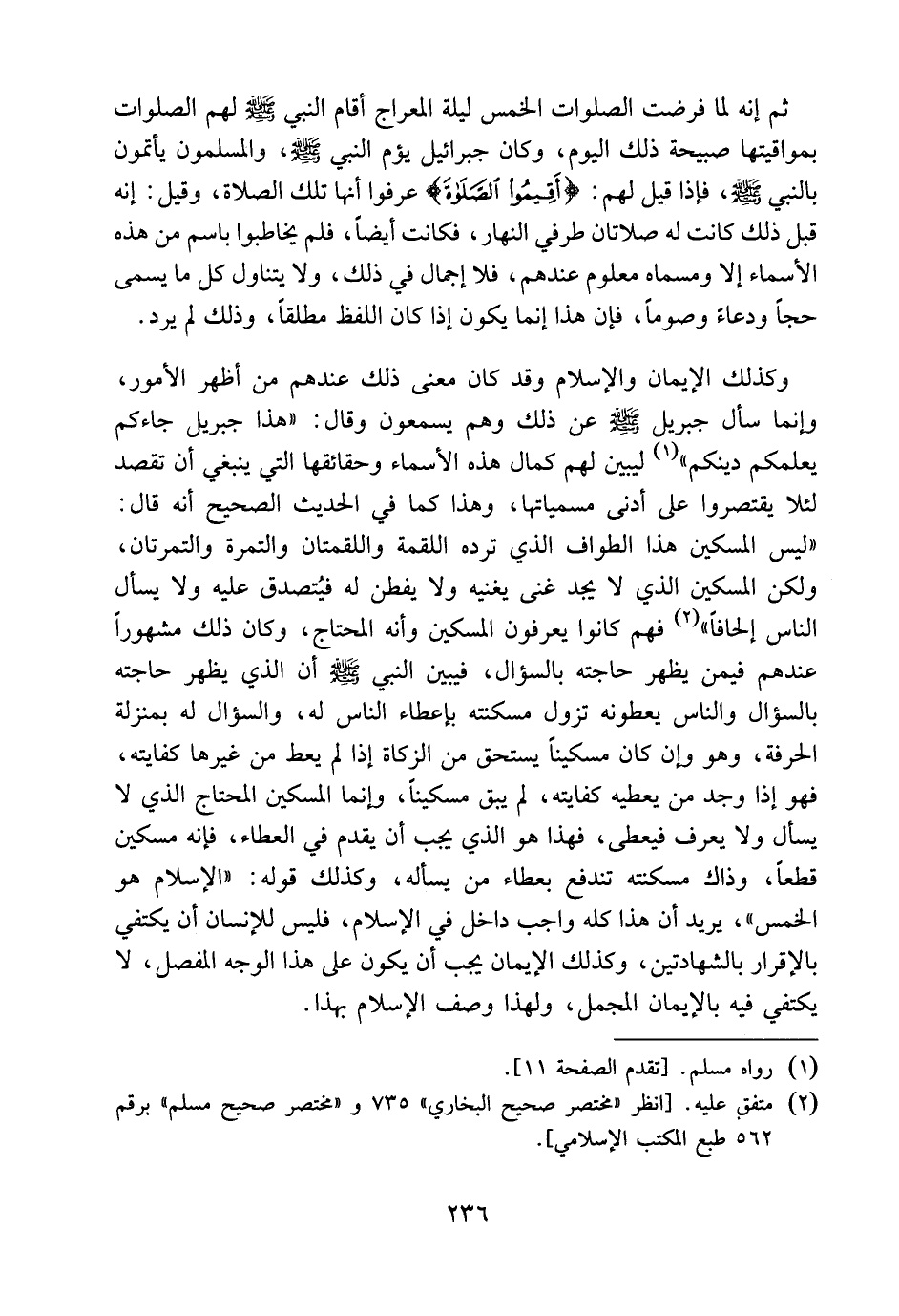 وكذلك الإيمان والإسلام وقد كان معنى ذلك عندهم من أظهر الأمور، وإنما سأل جبريل النبي صلى الله عليه وسلم عن ذلك وهم يسمعون وقال: " هذا جبريل جاءكم يعلمكم دينكم "؛ ليبين لهم كمال هذه الأسماء وحقائقها التي ينبغي أن تقصد لئلا يقتصروا على أدنى مسمياتها، وهذا كما في الحديث الصحيح أنه قال: " ليس المسكين هذا الطواف الذي ترده اللقمة واللقمتان والتمرة والتمرتان، ولكن المسكين الذي لا يجد غنى يغنيه، ولا يفطن له فيتصدق عليه، ولا يسأل الناس إلحافاً ". فهم كانوا يعرفون المسكين وأنه المحتاج، وكان ذلك مشهوراً عندهم فيمن يظهر حاجته بالسؤال، فبين النبي صلى الله عليه وسلم أن الذي يظهر حاجته بالسؤال والناس يعطونه، تزول مسكنته بإعطاء الناس له، والسؤال له بمنزلة الحرفة، وهو وإن كان مسكيناً يستحق من الزكاة إذا لم يعط من غيرها كفايته، فهو إذا وجد من يعطيه كفايته لم يبق مسكيناً، وإنما المسكين المحتاج الذي لا يسأل ولا يعرف فيعطى. فهذا هو الذي يجب أن يقدم في العطاء، فإنه مسكين قطعاً، وذاك مسكنته تندفع بعطاء من يسأله، وكذلك قوله: [الإسلام هو الخمس] ، يريد أن هذا كله واجب داخل في الإسلام، فليس للإنسان أن يكتفي بالإقرار بالشهادتين، وكذلك الإيمان يجب أن يكون على هذا الوجه المفصل، لا يكتفي فيه بالإيمان المجمل؛ ولهذا وصف الإسلام بهذا.