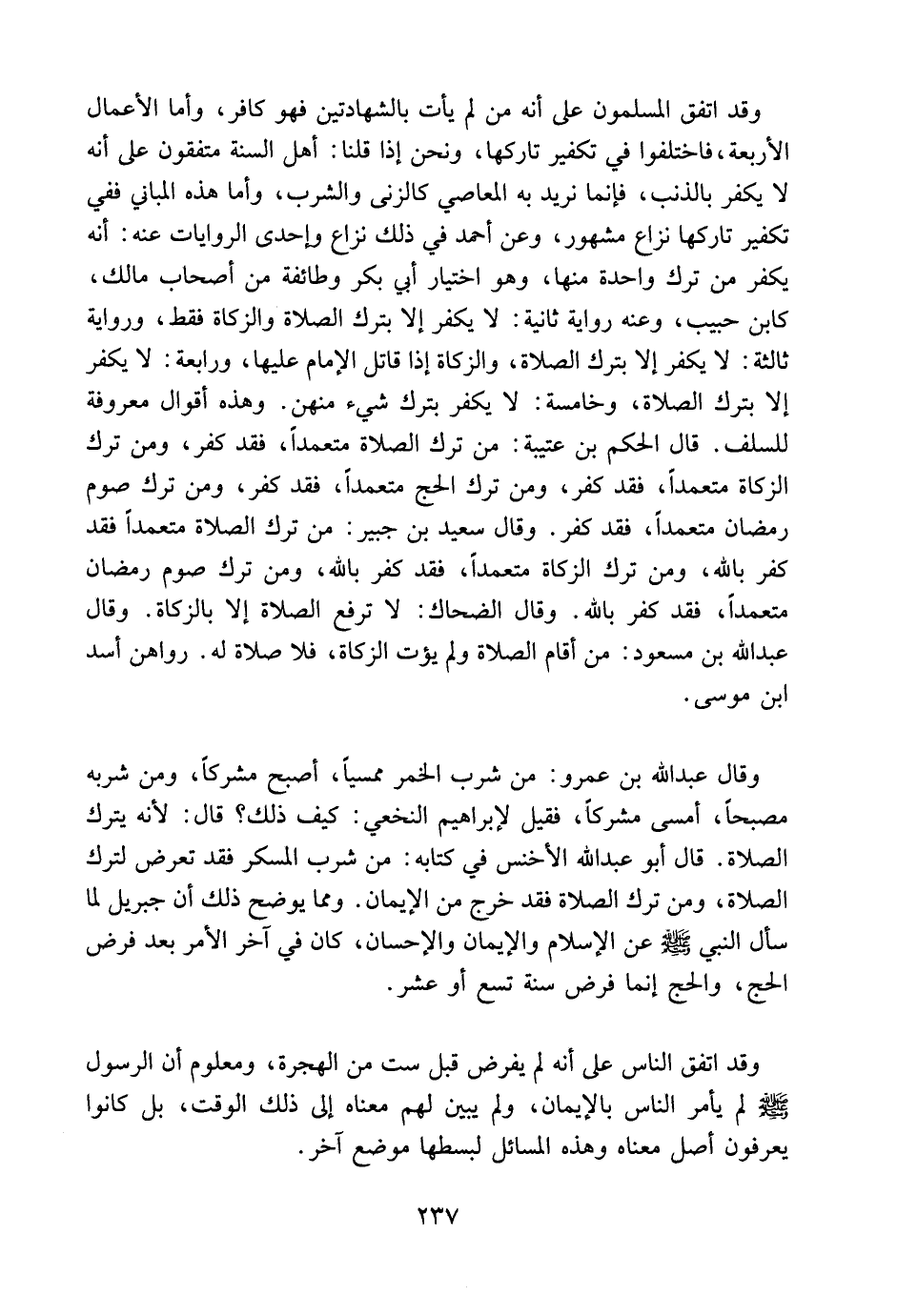 وقد اتفق المسلمون على أنه من لم يأت بالشهادتين فهو كافر، وأما الأعمال الأربعة فاختلفوا في تكفير تاركها، ونحن إذا قلنا: أهل السنة متفقون على أنه لا يكفر بالذنب، فإنما نريد به المعاصي كالزنا والشرب، وأما هذه المباني ففي تكفير تاركها نزاع مشهور. وعن أحمد في ذلك نزاع، وإحدي الروايات عنه: أنه يكفر من ترك واحدة منها، وهو اختيار أبي بكر وطائفة من أصحاب مالك كابن حبيب. وعنه رواية ثانية: لا يكفر إلا بترك الصلاة والزكاة فقط، ورواية ثالثة: لا يكفر إلا بترك الصلاة، والزكاة إذا قاتل الإمام عليها. ورابعة: لا يكفر إلا بترك الصلاة. وخامسة: لا يكفر بترك شيء منهن، وهذه أقوال معروفة للسلف. قال الحكم بن عتيبة: من ترك الصلاة متعمداً فقد كفر، ومن ترك الزكاة متعمداً فقد كفر. ومن ترك الحج متعمداً فقد كفر. ومن ترك صوم رمضان متعمداً فقد كفر. وقال سعيد بن جُبَيْر: من ترك الصلاة متعمداً فقد كفر بالله. ومن ترك الزكاة متعمداً فقد كفر بالله. ومن ترك صوم رمضان متعمداً فقد كفر بالله. وقال الضحاك: لا ترفع الصلاة إلا بالزكاة، وقال عبد الله بن مسعود: من أقام الصلاة ولم يؤت الزكاة فلا صلاة له. رواهن أسد بن موسى.