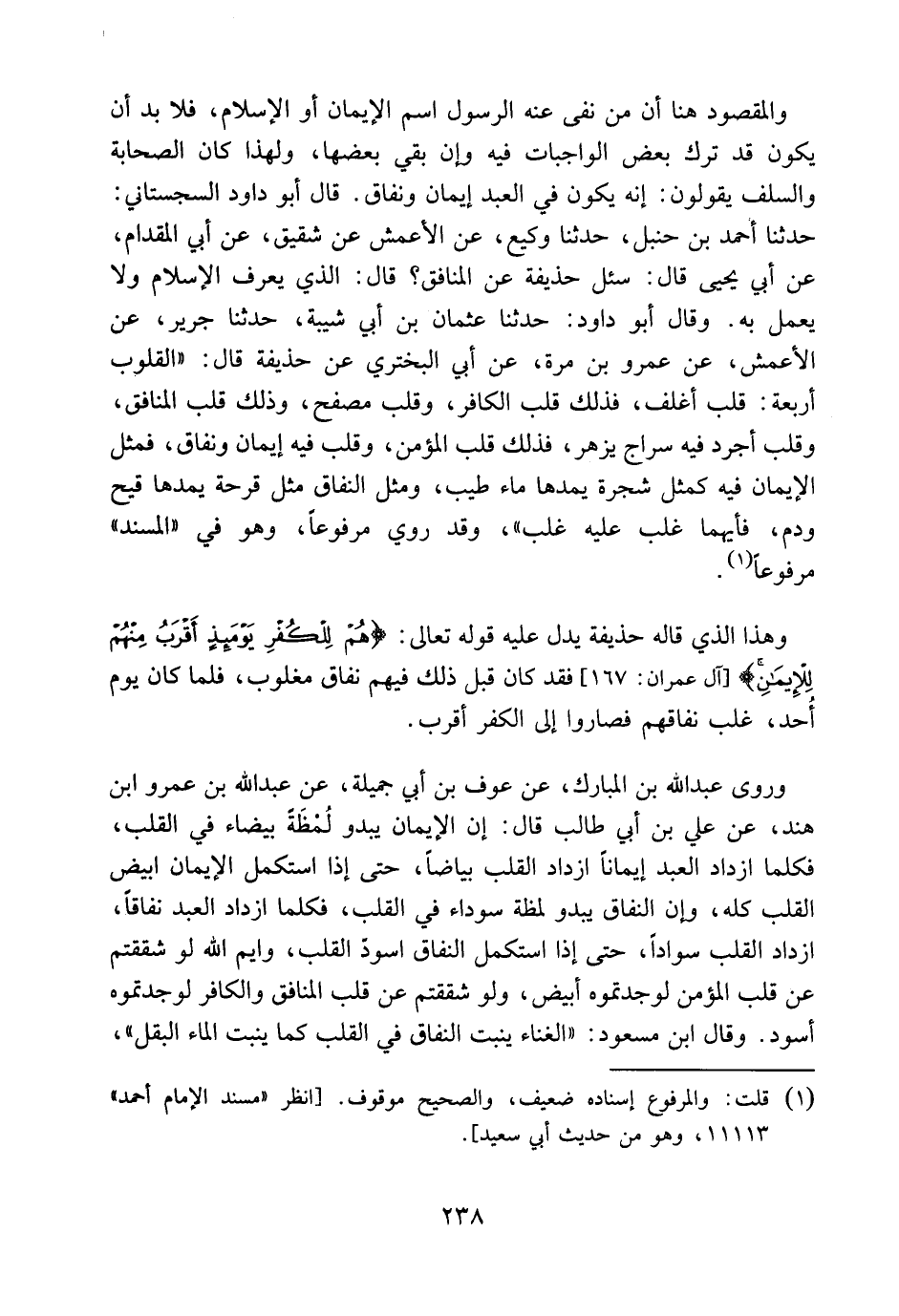 والمقصود هنا أن من نفى عنه الرسول اسم الإيمان أو الإسلام فلابد أن يكون قد ترك بعض الواجبات فيه وإن بقى بعضها؛ ولهذا كان الصحابة والسلف يقولون: إنه يكون في العبد إيمان ونفاق، قال أبو داود السجستاني: حدثنا أحمد بن حنبل، حدثنا وَكِيع، عن الأْعمش، عن شقيق، عن أبي المِقْدَام، عن أبي يحيى قال: سئل حذيفة عن المنافق. قال: الذي يعرف الإسلام ولا يعمل به. وقال أبو داود: حدثنا عثمان بن أبي شيبة، حدثنا جرير، عن الأعمش، عن عمرو بن مرة، عن أبي البختري، عن حذيفة قال: القلوب أربعة: قلب أغْلَف، فذلك قلب الكافر، وقلب مُصْفَح، وذلك قلب المنافق، وقلب أجرد فيه سراج يُزْهِر، فذلك قلب المؤمن، وقلب فيه إيمان ونفاق، فمثل الإيمان فيه كمثل شجرة يمدها ماء طيب، ومثل النفاق مثل قُرْحَة يمدها قَيْحٌ ودم، فأيهما غَلَب عليه غَلَب. وقد روى مرفوعاً، وهو في [المسند] مرفوعاً.