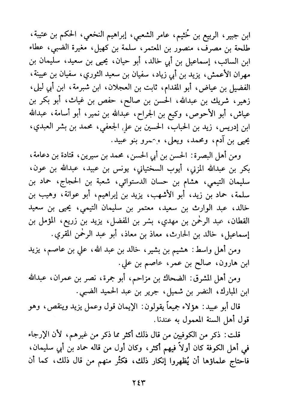 قال أبو عبيد: هؤلاء جميعاً يقولون: الإيمان قول وعمل، يزيد وينقص، وهو قول أهل السنة المعمول به عندنا.