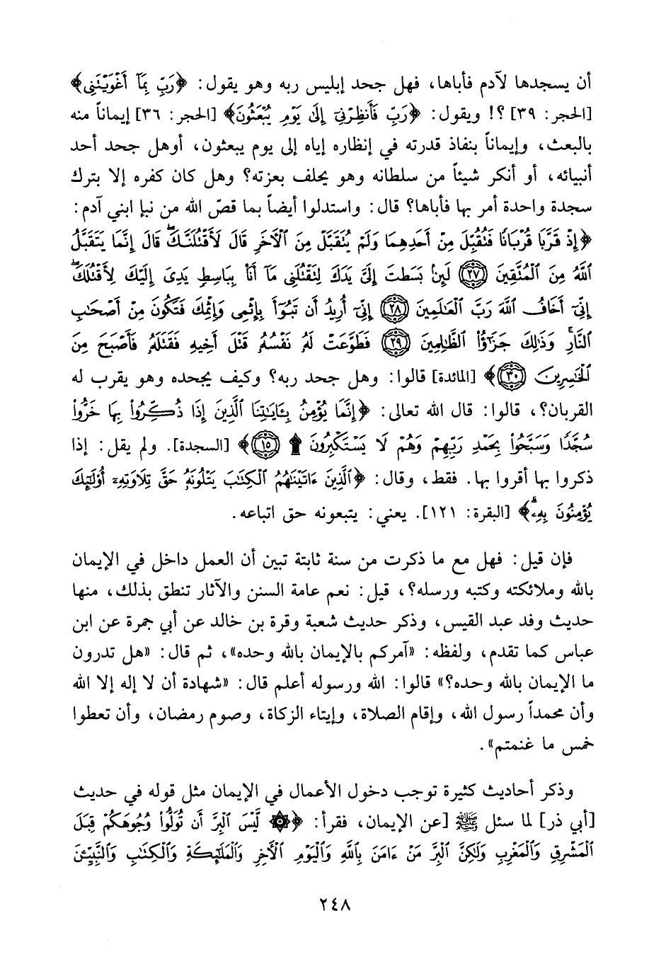 وذكر أحاديث كثيرة توجب دخول الأعمال في الإيمان مثل قوله في حديث. . . لما سئل صلى الله عليه وسلم عن الإيمان فقرأ: {لَيْسَ الْبِرَّ أَنْ تُوَلُّوا وُجُوهَكُمْ قِبَلَ الْمَشْرِقِ وَالْمَغْرِبِ وَلَكِنَّ الْبِرَّ مَنْ آمَنَ بِاللَّهِ وَالْيَوْمِ الْآخِرِ وَالْمَلائِكَةِ وَالْكِتَابِ وَالنَّبِيِّينَ