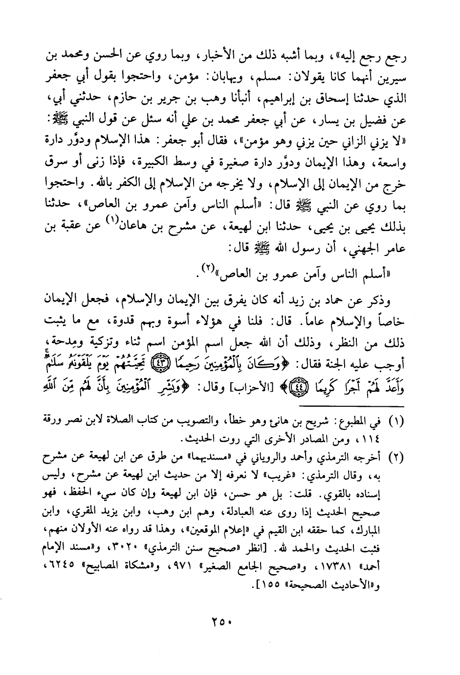 رجع رجع إليه "، وبما أشبه ذلك من الأخبار، وبما روي عن الحسن ومحمد بن سيرين أنهما كانا يقولان: مسلم، ويهابان: مؤمن، واحتجوا بقول أبي جعفر الذي حدثناه إسحاق بن إبراهيم، أنبأنا وهب بن جرير بن حازم، حدثني أبي، عن فضيل بن بشار، عن أبي جعفر محمد ابن علي؛ أنه سئل عن قول النبي صلى الله عليه وسلم: " لا يزني الزاني حين يزني وهو مؤمن "، فقال أبو جعفر: هذا الإسلام ودور دارة واسعة، وهذا الإيمان ودور دارة صغيرة في وسط الكبيرة، فإذا زنى أو سرق خرج من الإيمان إلى الإسلام، ولا يخرجه من الإسلام إلا الكفر بالله، واحتجوا بما روي عن النبي صلى الله عليه وسلم قال: " أسلم الناس وآمن عمرو بن العاص "، حدثنا بذلك يحيى بن يحيى، حدثنا ابن لهيعة، عن شريح بن هانئ، عن عقبة بن عامر الجهني، أن رسول الله صلى الله عليه وسلم قال: " أسلم الناس، وآمن عمرو بن العاص ".