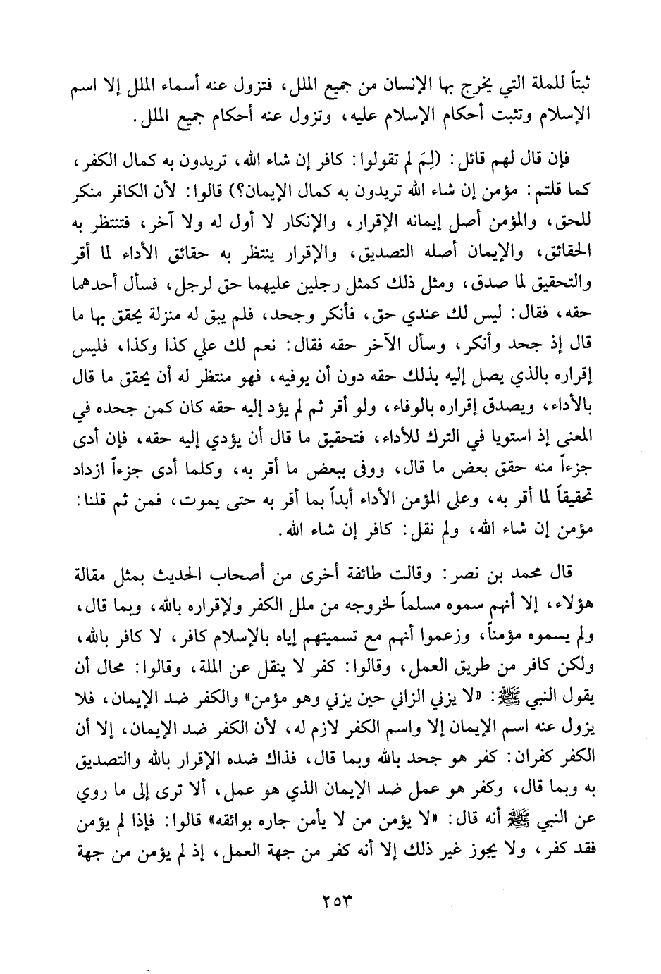 قال محمد بن نصر: وقالت طائفة أخرى من أصحاب الحديث بمثل مقالة هؤلاء، إلا أنهم سموه مسلماً لخروجه من ملل الكفر ولإقراره بالله وبما قال، ولم يسموه مؤمناً، وزعموا أنهم مع تسميتهم إياه بالإسلام كافر، لا كافر بالله، ولكن كافر من طريق العمل، وقالوا: كفر لا ينقل عن الملة، وقالوا: محال أن يقول النبي صلى الله عليه وسلم: " لا يزني الزاني حين يزني وهو مؤمن " والكفر ضد الإيمان، فلا يزول عنه اسم الإيمان إلا واسم الكفر لازم له؛ لأن الكفر ضد الإيمان، إلا أن الكفر كفران: كفر هو جحد بالله وبما قال فذاك ضده الإقرار بالله والتصديق به وبما قال، وكفر هو عمل فهو ضد الإيمان الذي هو عمل، ألا ترى إلى ما روي عن النبي صلى الله عليه وسلم أنه قال: " لا يؤمن من لا يأمن جاره بوائقه ". قالوا: فإذا لم يؤمن فقد كفر، ولا يجوز غير ذلك إلا أنه كفر من جهة العمل؛ إذ لم يؤمن من جهة