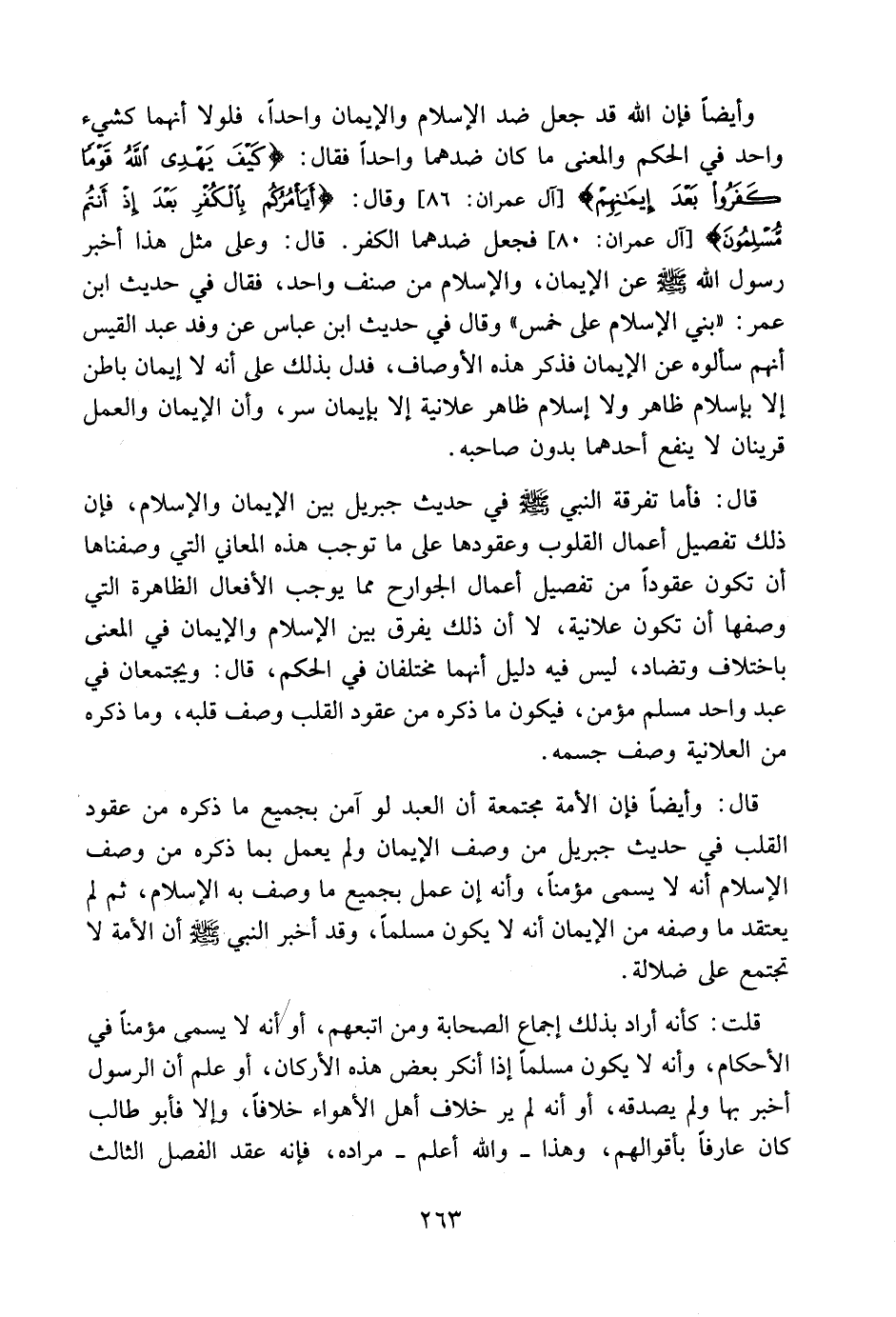 وأيضاً، فإن الله قد جعل ضد الإسلام والإيمان واحداً، فلولا أنهما كشيء واحد في الحكم والمعني ما كان ضدهما واحداً فقال: {كَيْفَ يَهْدِي اللهُ قَوْمًا كَفَرُواْ بَعْدَ إِيمَانِهِمْ} [آل عمران: 86] ، وقال: {أَيَأْمُرُكُم بِالْكُفْرِ بَعْدَ إِذْ أَنتُم مُّسْلِمُونَ} [آل عمران: 80] فجعلَ ضدهما الكفر. قال: وعلى مثل هذا أخبر رسول الله صلى الله عليه وسلم عن الإيمان، والإسلام من صنف واحد، فقال في حديث ابن عمر: " بني الإسلام على خمس "، وقال في حديث ابن عباس عن وفد عبد القيس أنهم سألوه عن الإيمان فذكر هذه الأوصاف، فدل بذلك على أنه لا إيمان باطن إلا بإسلام ظاهر، ولا إسلام ظاهر علانية إلا بإيمان سر، وأن الإيمان والعمل قرينان، لا ينفع أحدهما بدون صاحبه.