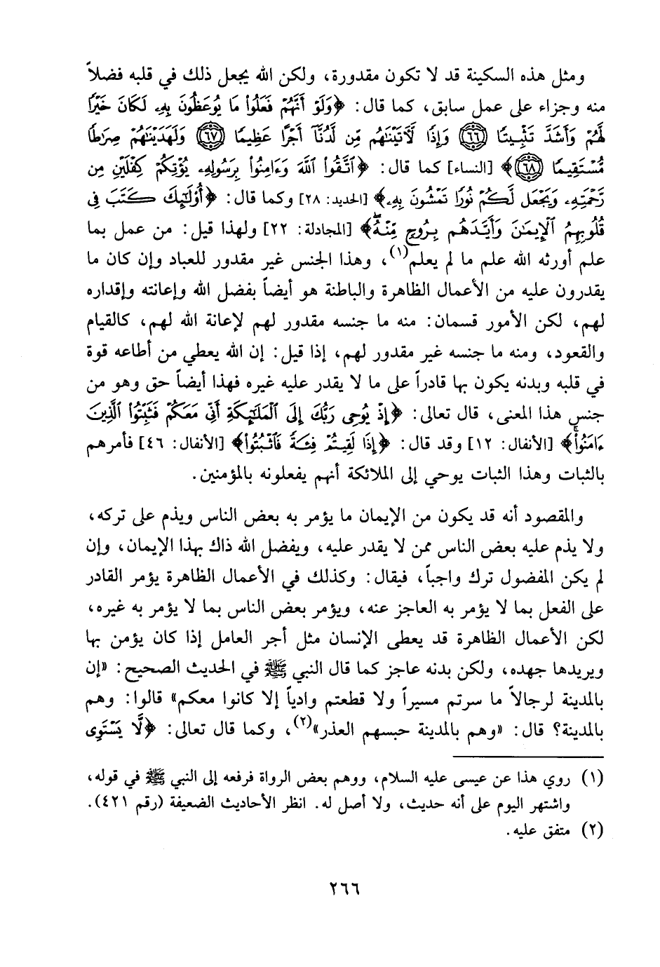 ومثل هذه السكينة قد لا تكون مقدورة، ولكن الله يجعل ذلك في قلبه، فضلاً منه وجزاء على عمل سابق، كما قال: {وَلَوْ أَنَّهُمْ فَعَلُواْ مَا يُوعَظُونَ بِهِ لَكَانَ خَيْرًا لَّهُمْ وَأَشَدَّ تَثْبِيتًا وَإِذاً لَّآتَيْنَاهُم مِّن لَّدُنَّا أَجْراً عَظِيمًا وَلَهَدَيْنَاهُمْ صِرَاطًا مُّسْتَقِيمًا} [النساء: 66: 68] ، كما قال: {اتَّقُوا اللَّهَ وَآمِنُوا بِرَسُولِهِ يُؤْتِكُمْ كِفْلَيْنِ مِن رَّحْمَتِهِ وَيَجْعَل لَّكُمْ نُورًا تَمْشُونَ بِهِ} [الحديد: 28] ، وكما قال: {أُوْلَئِكَ كَتَبَ فِي قُلُوبِهِمُ الْإِيمَانَ وَأَيَّدَهُم بِرُوحٍ مِّنْهُ} [المجادلة: 22] ؛ ولهذا قيل: من عمل بما علم أورثه الله علم ما لم يعلم، وهذا الجنس غير مقدور للعباد، وإن كان ما يقدرون عليه من الأعمال الظاهرة والباطنة هو أيضاً بفضل الله وإعانته وإقداره لهم، لكن الأمور قسمان: منه ما جنسه مقدور لهم لإعانة الله لهم، كالقيام والقعود، ومنه ما جنسه غير مقدور لهم، إذا قيل: إن الله يعطي من أطاعه قوة في قلبه وبدنه يكون بها قادراً على ما لا يقدر عليه غيره، فهذا أيضاً حق وهو من جنس هذا المعنى، قال تعالى: {إِذْ يُوحِي رَبُّكَ إِلَى الْمَلآئِكَةِ أَنِّي مَعَكُمْ فَثَبِّتُواْ الَّذِينَ آمَنُواْ} [الأنفال: 12] ، وقد قال: {إِذَا لَقِيتُمْ فِئَةً فَاثْبُتُواْ} [الأنفال: 45] ، فأمرهم بالثبات وهذا الثبات، يوحى إلى الملائكة أنهم يفعلونه بالمؤمنين.
