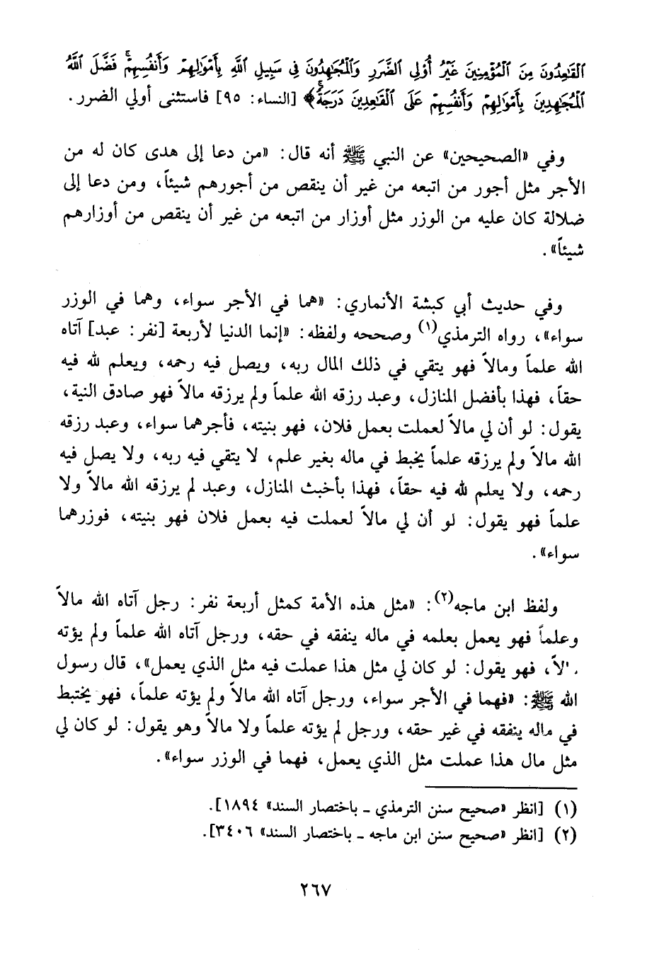 وفي الصحيحين عن النبي صلى الله عليه وسلم أنه قال: " من دعا إلى هدى كان له من الأجر مثل أجور من اتبعه، من غير أن ينقص من أجورهم شيئًا، ومن دعا إلى ضلالة كان عليه من الوزر مثل أوزار من اتبعه من غير أن ينقص من أوزارهم شيئا ". وفي حديث أبي كَبْشَة الأنماري: " هما في الأجر سواء، وهما في الوزر سواء "، رواه الترمذي وصححه ولفظه: " إنما الدنيا لأربعة: رجل آتاه الله علماً ومالاً فهو يتقي في ذلك المال ربه، ويصل فيه رحمه، ويعلم لله فيه حقاً، فهذا بأفضل المنازل، وعبد رزقه الله علماً ولم يرزقه مالاً فهو صادق النية، يقول: لو أن لي مالا لعملت بعمل فلان فهو بنيته، فأجرهما سواء، وعبد رزقه الله مالاً ولم يرزقه علماً يخبط في ماله بغير علم، لا يتقي فيه ربه، ولا يصل فيه رحمه، ولا يعلم لله فيه حقاً، فهذا بأخبث المنازل، وعبد لم يرزقه الله مالاً ولا علماً فهو يقول: لو أن لي مالا لعملت فيه بعمل فلان فهو بنيته، فوزرهما سواء ".