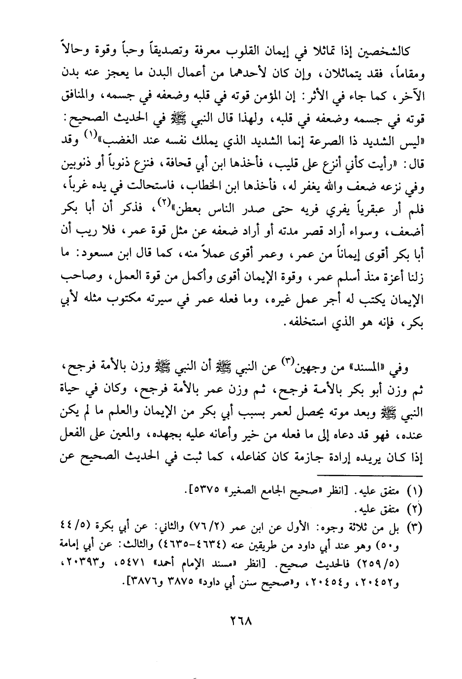 كالشخصين إذا تماثلا في إيمان القلوب معرفة وتصديقاً، وحباً وقوة وحالاً ومقاماً، فقد يتماثلان، وإن كان لأحدهما من أعمال البدن ما يعجز عنه بدن الآخر، كما جاء في الأثر: " إن المؤمن قوته في قلبه، وضعفه في جسمه، والمنافق قوته في جسمه، وضعفه في قلبه "؛ ولهذا قال النبي صلى الله عليه وسلم في الحديث الصحيح: " ليس الشديد ذو الصُّرَعَة، إنما الشديد الذي يملك نفسه عند الغضب "، وقد قال: " رأيت كأني أنزع على قَلِيبٍ، فأخذها ابن أبي قُحَافة، فنزع ذَنُوباً أو ذنوبين، وفي نَزْعِه ضعف، والله يغفر له، فأخذها ابن الخطاب فاستحالت في يده غَرْباً، فلم أر عبقريًا يَفْري فَرْيَه، حتى صَدَرَ الناس بعطن "، فذكر أن أبا بكر أضعف، وسواء أراد قصر مدته أو أراد ضعفه عن مثل قوة عمر، فلا ريب أن أبا بكر أقوى إيماناً من عمر، وعمر أقوي عملاً منه، كما قال ابن مسعود: ما زلنا أعزة منذ أسلم عمر. وقوة الإيمان أقوى وأكمل من قوة العمل، وصاحب الإيمان يكتب له أجر عمل غيره، وما فعله عمر في سيرته مكتوب مثله لأبي بكر فإنه هو الذي استخلفه.