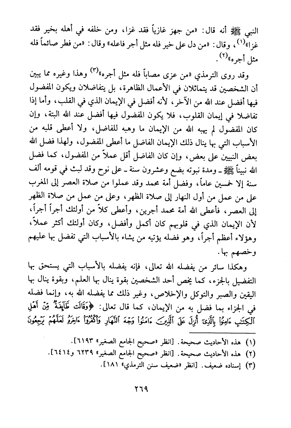 وقد روى الترمذي: " من عزى مصاباً فله مثل أجره " وهذا وغيره مما يبين أن الشخصين قد يتماثلان في الأعمال الظاهرة، بل يتفاضلان ويكون المفضول فيها أفضل عند الله من الآخر؛ لأنه أفضل في الإيمان الذي في القلب، وأما إذا تفاضلا في إيمان القلوب فلا يكون المفضول فيها أفضل عند الله البتة، وإن كان المفضول لم يهبه الله من الإيمان ما وهبه للفاضل، ولا أعطى قلبه من الأسباب التي بها ينال ذلك الإيمان الفاضل ما أعطى المفضول؛ ولهذا فضل الله بعض النبيين على بعض، وإن كان الفاضل أقل عملاً من المفضول، كما فضل الله نبينا صلى الله عليه وسلم ومدة نبوته بضع وعشرون سنة على نوح وقد لبث في قومه ألف سنة إلا خمسين عاماً، وفضل أمة محمد، وقد عملوا من صلاة العصر إلى المغرب، على من عمل من أول النهار إلى صلاة الظهر، وعلى من عمل من صلاة الظهر إلى العصر، فأعطى الله أمة محمد أجرين، وأعطى كلا من أولئك أجرًا أجرًا؛ لأن الإيمان الذي في قلوبهم كان أكمل وأفضل، وكان أولئك أكثر عملاً، وهؤلاء أعظم أجراً، وهو فضله يؤتيه من يشاء بالأسباب التي تفضل بها عليهم وخصهم بها.