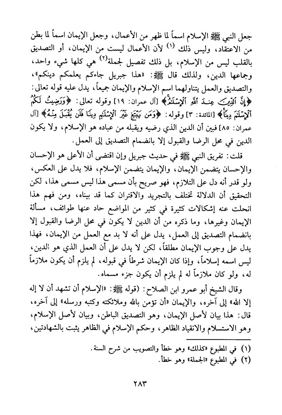 وقال الشيخ أبو عمرو بن الصلاح: قوله صلى الله عليه وسلم: " الإسلام أن تشهد أن لا إله إلا الله " إلى آخره، و " الإيمان أن تؤمن بالله وملائكته وكتبه ورسله " إلى آخره. قال: هذا بيان لأصل الإيمان، وهوالتصديق الباطن وبيان لأصل الإسلام، وهو الاستسلام والانقياد الظاهر. وحكم الإسلام في الظاهر يثبت بالشهادتين،