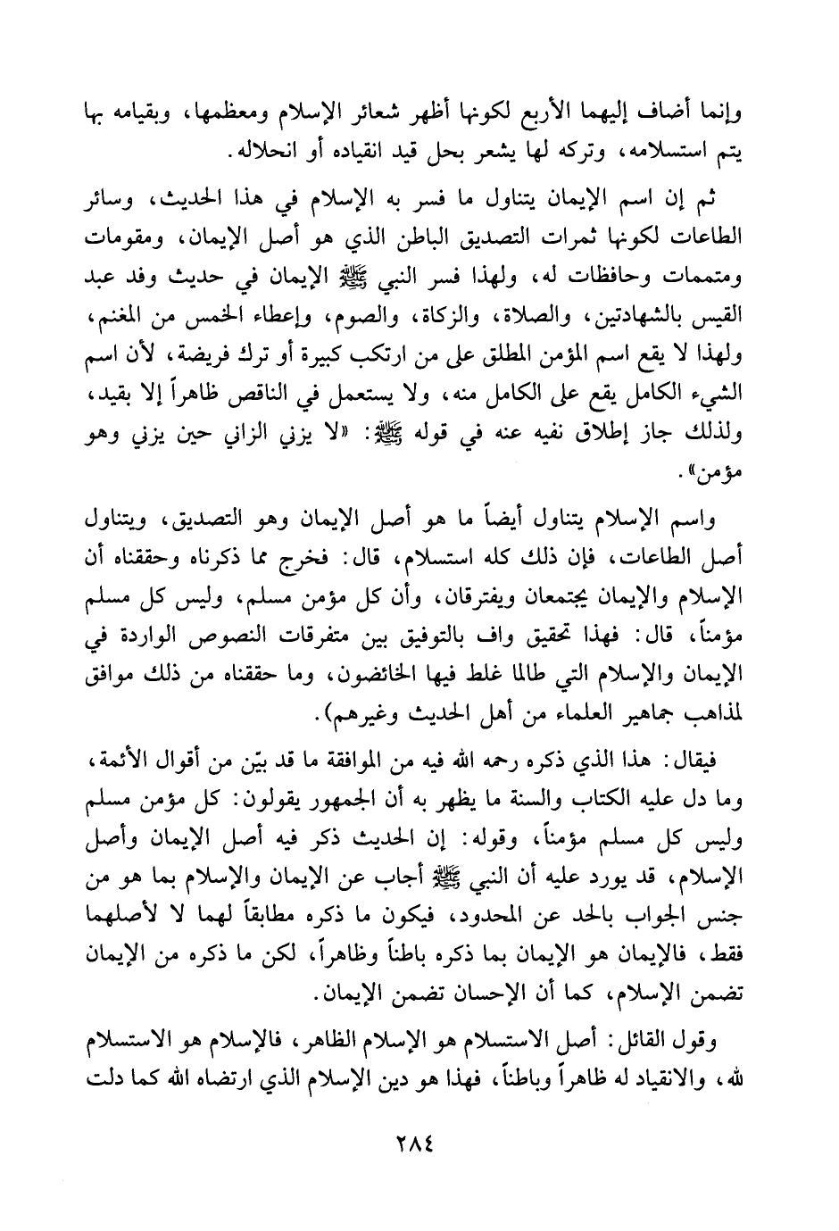 واسم الإسلام يتناول أيضاً ما هو [أصل الإيمان] وهو التصديق، ويتناول [أصل الطاعات] فإن ذلك كله استسلام. قال: فخرج مما ذكرناه وحققناه أن الإسلام والإيمان يجتمعان ويفترقان؛ وأن كل مؤمن مسلم، وليس كل مسلم مؤمناً. قال: فهذا تحقيق واف بالتوفيق بين متفرقات النصوص الواردة في الإيمان والإسلام، التي طالما غلط فيها الخائضون، وما حققناه من ذلك موافق لمذاهب جماهير العلماء من أهل الحديث وغيرهم.