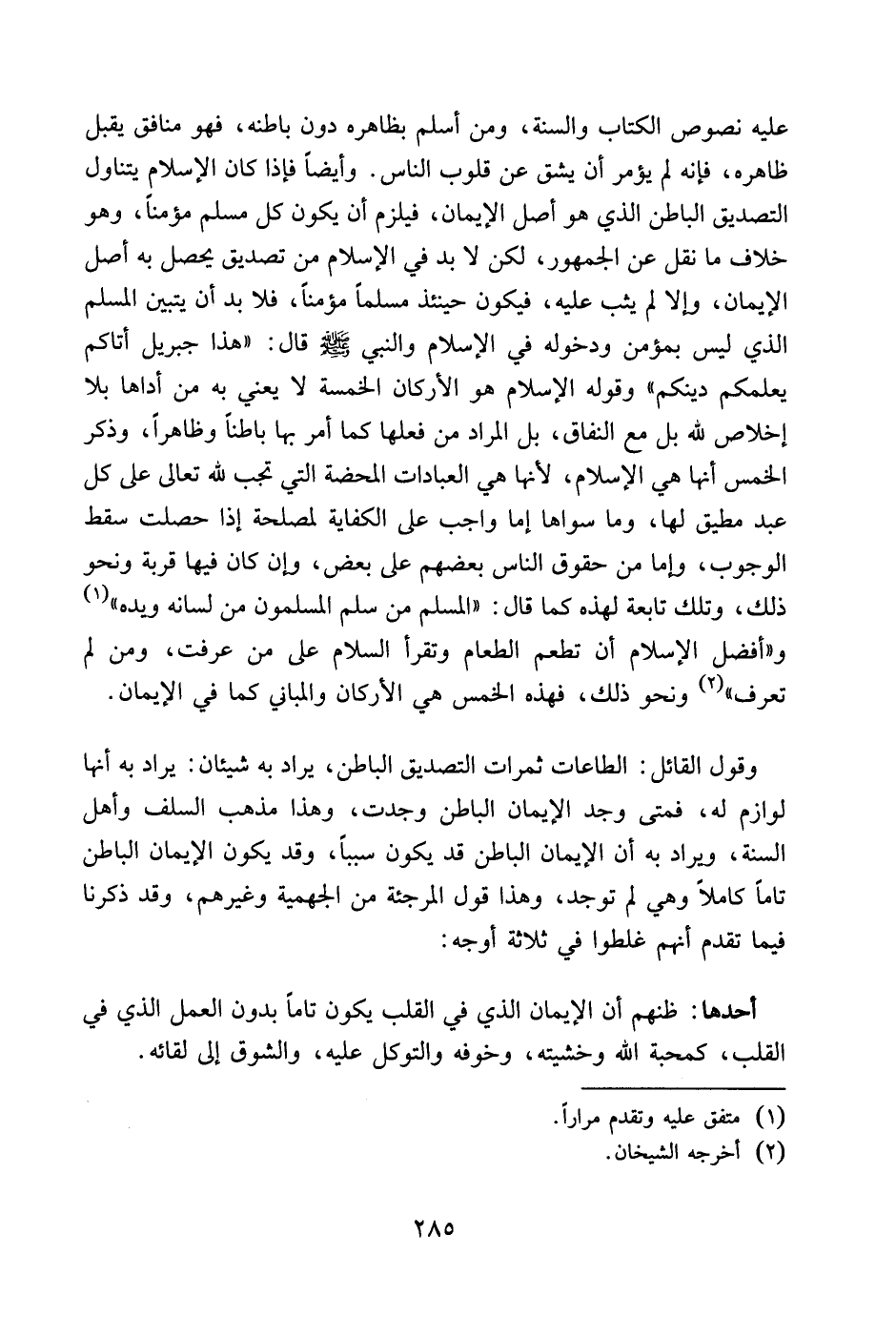 عليه نصوص الكتاب والسنة، ومن أسلم بظاهره دون باطنه فهو منافق يقبل ظاهره، فإنه لم يؤمر أن يشق عن قلوب الناس، وأيضاً فإذا كان الإسلام يتناول التصديق الباطن الذي هو أصل الإيمان، فيلزم أن يكون كل مسلم مؤمناً، وهو خلاف ما نقل عن الجمهور، ولكن لابد في الإسلام من تصديق يحصل به أصل الإيمان، وإلا لم يثب عليه، فيكون حينئذ مسلماً مؤمناً، فلابد أن يتبين المسلم الذي ليس بمؤمن ودخوله في الإسلام، والنبي صلى الله عليه وسلم قال: " هذا جبريل أتاكم يعلمكم دينكم "، وقوله: " الإسلام هو الأركان الخمسة " لا يعني به من أداها بلا إخلاص لله بل مع النفاق، بل المراد من فعلها كما أمر بها باطناً وظاهراً، وذكر الخمس أنها هي الإسلام لأنها هي العبادات المحضة التي تجب لله تعالى على كل عبد مطيق لها، وما سواها إما واجب على الكفاية لمصلحة إذا حصلت سقط الوجوب، وإما من حقوق الناس بعضهم على بعض وإن كان فيها قربة ونحو ذلك، وتلك تابعة لهذه، كما قال: " المسلم من سلم المسلمون من لسانه ويده " و " أفضل الإسلام أن تُطعِم الطعام، وتُقرِئ السلام على من عرفت ومن لم تعرف " ونحو ذلك: فهذه الخمس هي الأركان والمباني كما في الإيمان.
