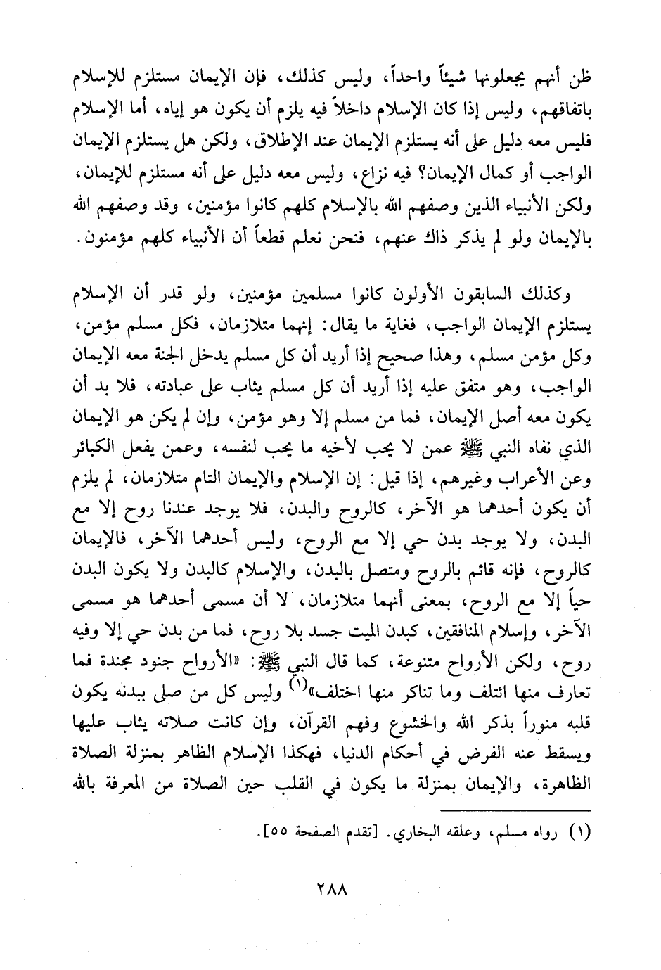 وكذلك السابقون الأولون كانوا مسلمين مؤمنين، ولو قدر أن الإسلام يستلزم الإيمان الواجب، فغاية ما يقال: إنهما متلازمان، فكل مسلم مؤمن، وكل مؤمن مسلم، وهذا صحيح إذا أريد أن كل مسلم يدخل الجنة معه الإيمان الواجب، وهو متفق عليه إذا أريد أن كل مسلم يثاب على عبادته، فلابد أن يكون معه أصل الإيمان فما من مسلم إلا وهو مؤمن، وإن لم يكن هو الإيمان الذي نفاه النبي صلى الله عليه وسلم، عمن لا يحب لأخيه ما يحب لنفسه، وعمن يفعل الكبائر، وعن الأعراب وغيرهم، فإذا قيل: إن الإسلام والإيمان التام متلازمان لم يلزم أن يكون أحدهما هو الآخر، كالروح والبدن، فلا يوجد عندنا روح إلا مع البدن، ولا يوجد بدن حي إلا مع الروح، وليس أحدهما الآخر، فالإيمان كالروح، فإنه قائم بالروح ومتصل بالبدن، والإسلام كالبدن، ولا يكون البدن حيًا إلا مع الروح، بمعنى أنهما متلازمان، لا أن مسمى أحدهما هو مسمى الآخر، وإسلام المنافقين كبدن الميت جسد بلا روح، فما من بدن حي إلا وفيه روح، ولكن الأرواح متنوعة كما قال النبي صلى الله عليه وسلم: " الأرواح جنود مجندة، فما تعارف منها ائتلف، وما تناكر منها اختلف " وليس كل من صلى ببدنه يكون قلبه منورًا بذكر الله والخشوع وفهم القرآن وإن كانت صلاته يثاب عليها ويسقط عنه الفرض في أحكام الدنيا فهكذا الإسلام الظاهر بمنزلة الصلاة الظاهرة، والإيمان بمنزلة ما يكون في القلب حين الصلاة من المعرفة بالله