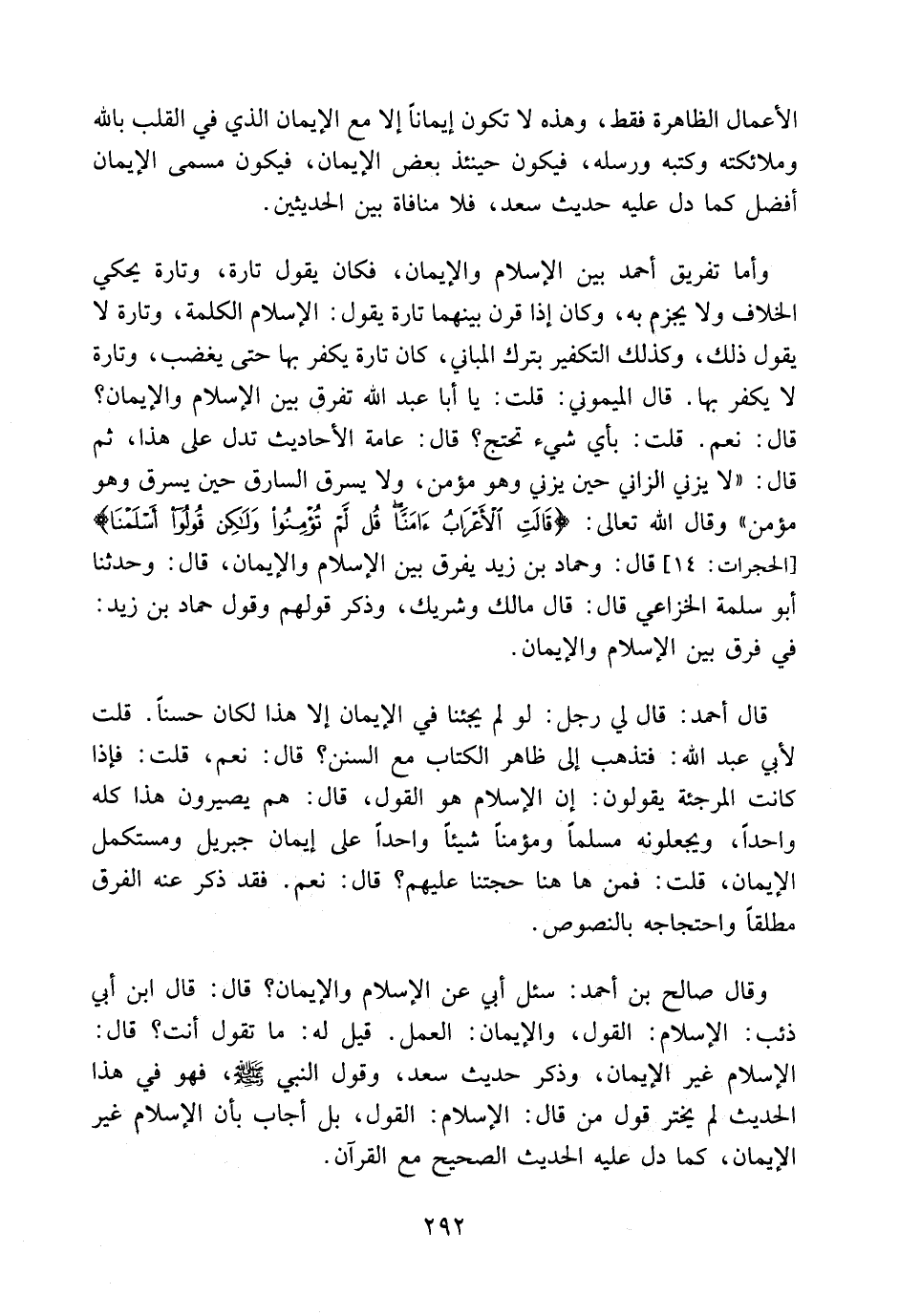 وقال صالح بن أحمد: سئل أبي عن الإسلام والإيمان، قال: قال ابن أبي ذئب: الإسلام: القول، والإيمان: العمل. قيل له: ما تقول أنت؟ قال: الإسلام غير الإيمان، وذكر حديث سعد، وقول النبي صلى الله عليه وسلم. فهو في هذا الحديث لم يختر قول من قال: الإسلام: القول، بل أجاب بأن الإسلام غير الإيمان، كما دل عليه الحديث الصحيح مع القرآن.