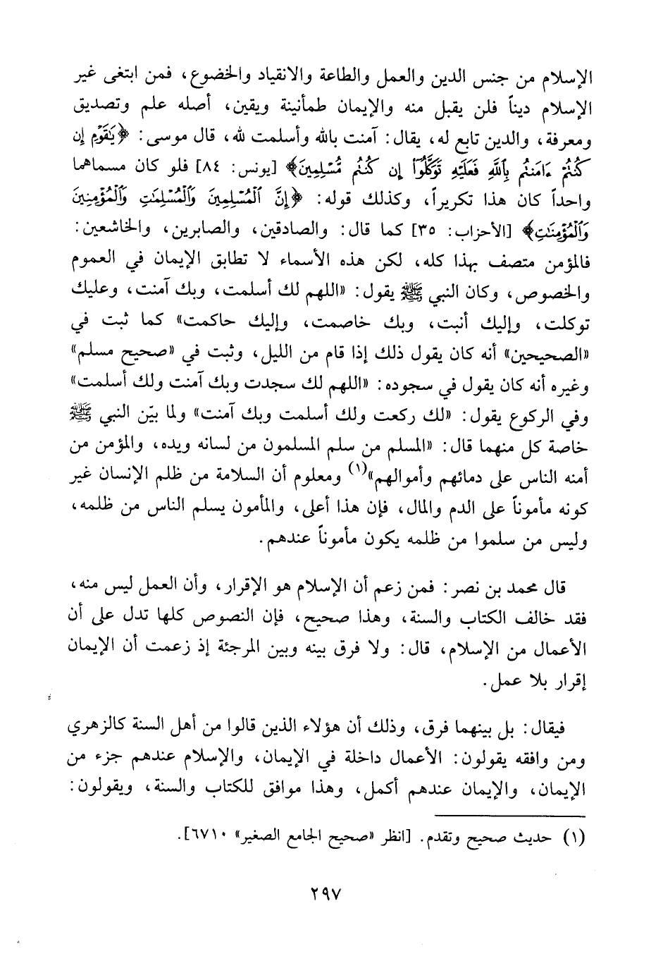 قال محمد بن نصر: فمن زعم أن الإسلام هو الإقرار، وأن العمل ليس منه، فقد خالف الكتاب والسنة، وهذا صحيح؛ فإن النصوص كلها تدل على أن الأعمال من الإسلام، قال: ولا فرق بينه وبين المرجئة؛ إذ زعمت أن الإيمان إقرار بلا عمل.