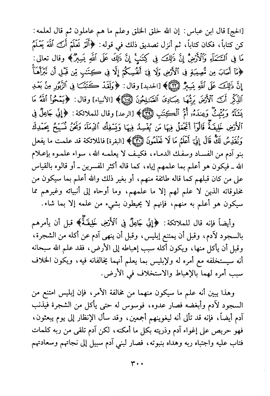 [الحج: 70] قال ابن عباس: إن الله خلق الخلق وعلم ما هم عاملون ثم قال لعلمه: كن كتابًا، فكان كتابًا، ثم أنزل تصديق ذلك في قوله: {أَلَمْ تَعْلَمْ أَنَّ اللَّهَ يَعْلَمُ مَا فِي السَّمَاء وَالأَرْضِ إِنَّ ذَلِكَ فِي كِتَابٍ إِنَّ ذَلِكَ عَلَى اللَّهِ يَسِيرٌ} وقال تعالى: {مَا أَصَابَ مِن مُّصِيبَةٍ فِي الأَرْضِ وَلَا فِي أَنفُسِكُمْ إِلَّا فِي كِتَابٍ مِّن قَبْلِ أَن نَّبْرَأَهَا إِنَّ ذَلِكَ عَلَى اللَّهِ يَسِيرٌ} [الحديد: 22] ، وقال: {وَلَقَدْ كَتَبْنَا فِي الزَّبُورِ مِن بَعْدِ الذِّكْرِ أَنَّ الأَرْضَ يَرِثُهَا عِبَادِيَ الصَّالِحُونَ} [الأنبياء: 105] ، وقال: {يَمْحُو اللهُ مَا يَشَاء وَيُثْبِتُ وَعِندَهُ أُمُّ الْكِتَابِ} [الرعد: 39] ، وقال للملائكة: {إِنِّي جَاعِلٌ فِي الأَرْضِ خَلِيفَةً قَالُواْ أَتَجْعَلُ فِيهَا مَن يُفْسِدُ فِيهَا وَيَسْفِكُ الدِّمَاء وَنَحْنُ نُسَبِّحُ بِحَمْدِكَ وَنُقَدِّسُ لَكَ قَالَ إِنِّي أَعْلَمُ مَا لاَ تَعْلَمُونَ} [البقرة: 30] ، فالملائكة قد علمت ما يفعل بنوا آدم من الفساد وسفك الدماء، فكيف لا يعلمه الله، سواء علموه بإعلام الله، فيكون هو أعلم بما علمهم إياه، كما قاله أكثر المفسرين أو قالوه بالقياس على من كان قبلهم، كما قاله طائفة منهم، أو بغير ذلك، والله أعلم بما سيكون من مخلوقاته الذين لا علم لهم إلا ما علمهم، وما أوحاه إلى أنبيائه وغيرهم مما سيكون هو أعلم به منهم، فإنهم لا يحيطون بشيء من علمه إلا بما شاء.