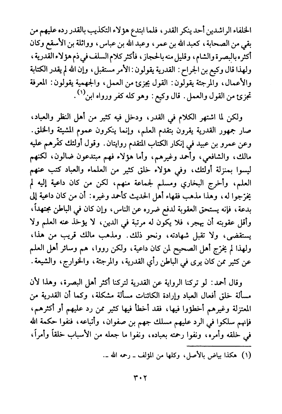 الخلفاء الراشدين أحد ينكر القدر، فلما ابتدع هؤلاء التكذيب بالقدر رده عليهم من بقى من الصحابة، كعبد الله بن عمر، وعبد الله بن عباس، وواثِلَة بن الأسْقَع، وكان أكثره بالبصرة والشام، وقليل منه بالحجاز، فأكثر كلام السلف في ذم هؤلاء القدرية؛ ولهذا قال وَكِيع بن الجرَّاح: القدرية يقولون: الأمر مستقبل، وأن الله لم يقدر الكتابة والأعمال، والمرجئة يقولون: القول يجزئ من العمل، والجهمية يقولون: المعرفة تجزئ من القول والعمل. قال وكيع: وهو كله كفر ورواه ابن. . .
