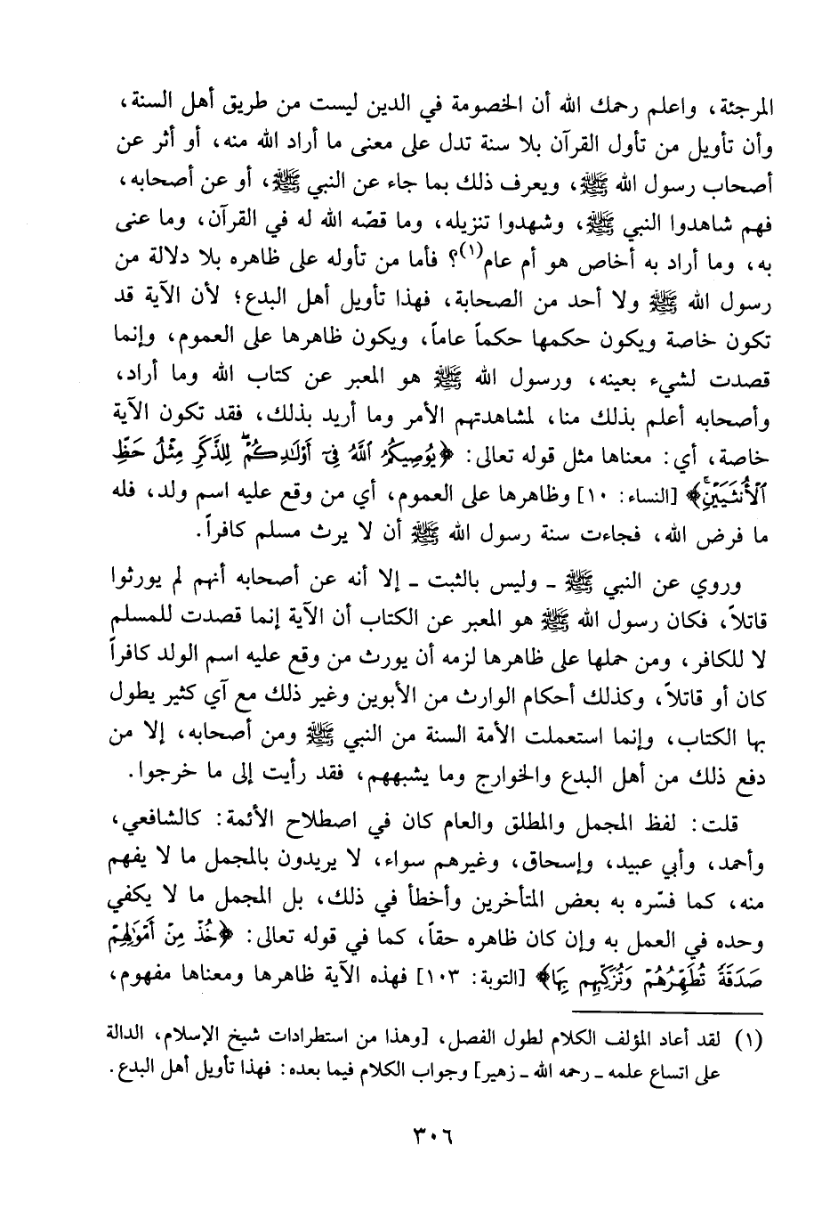 قلت: لفظ المجمل والمطلق والعام كان في اصطلاح الأئمة، كالشافعي وأحمد، وأبي عبيد وإسحاق وغيرهم سواء، لا يريدون بالمجمل ما لا يفهم منه، كما فسره به بعض المتأخرين وأخطأ في ذلك، بل المجمل ما لا يكفي وحده في العمل به وإن كان ظاهره حقًا، كما في قوله تعالى: {خُذْ مِنْ أَمْوَالِهِمْ صَدَقَةً تُطَهِّرُهُمْ وَتُزَكِّيهِم بِهَا} [التوبة: 103] ، فهذه الآية ظاهرها ومعناها مفهوم،