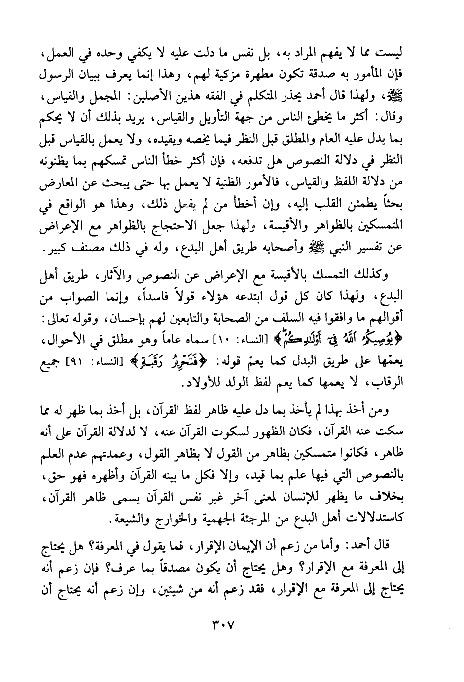 وكذلك التمسك بالأقيسة مع الإعراض عن النصوص والآثار طريق أهل البدع؛ ولهذا كان كل قول ابتدعه هؤلاء قولاً فاسدًا، وإنما الصواب من أقوالهم ما وافقوا فيه السلف من الصحابة والتابعين لهم بإحسان، وقوله تعالى: {يُوصِيكُمُ اللهُ فِي أَوْلاَدِكُمْ} [النساء: 11] سماه عامًا وهو مطلق في الأحوال، يعمها على طريق البدل، كما يعم قوله: {فَتَحْرِيرُ رَقَبَةٍ} [المجادلة: 3] جميع الرقاب، لا يعمها كما يعم لفظ الولد للأولاد، ومن أخذ بهذا لم يأخذ بما دل عليه ظاهر لفظ القرآن، بل أخذ بما ظهر له مما سكت عنه القرآن، فكان الظهور لسكوت القرآن عنه، لا لدلالة القرآن على أنه ظاهر، فكانوا متمسكين بظاهر من القول لا بظاهر القول، وعمدتهم عدم العلم بالنصوص التي فيها علم بما قيد، وإلا فكل ما بينه القرآن وأظهره فهو حق، بخلاف ما يظهر للإنسان لمعنى آخر غير نفس القرآن يسمى ظاهر القرآن. كاستدلالات أهل البدع من المرجئة والجهمية والخوارج والشيعة.